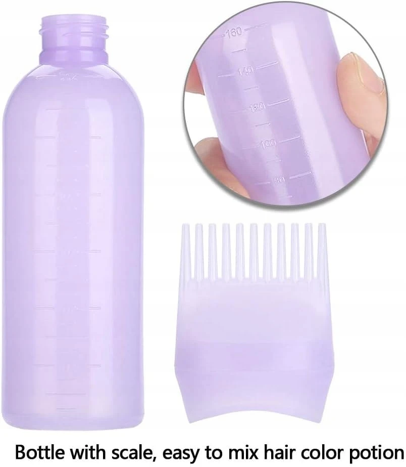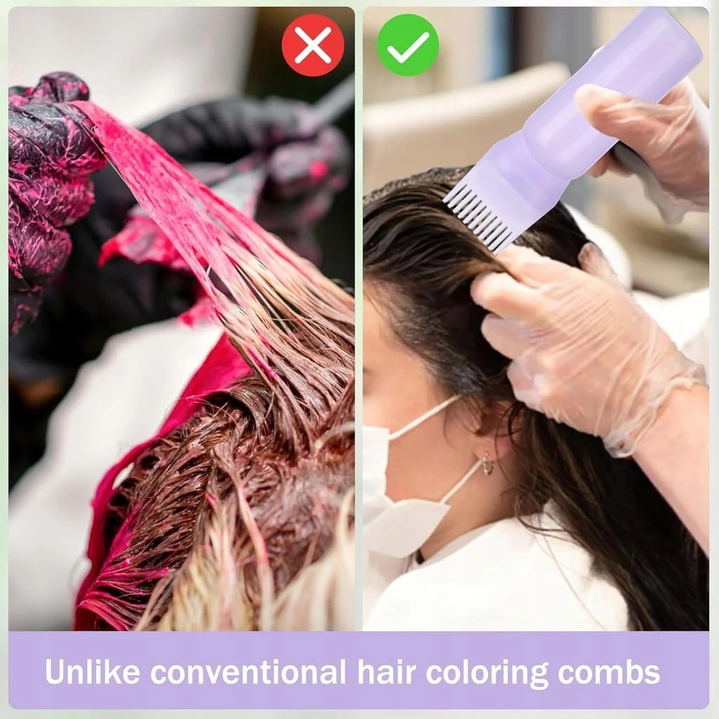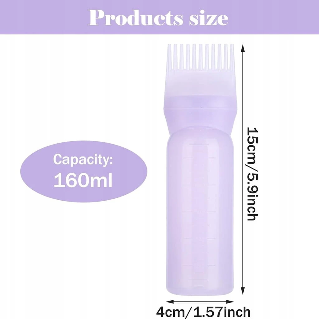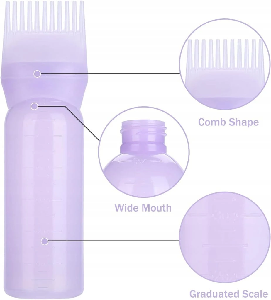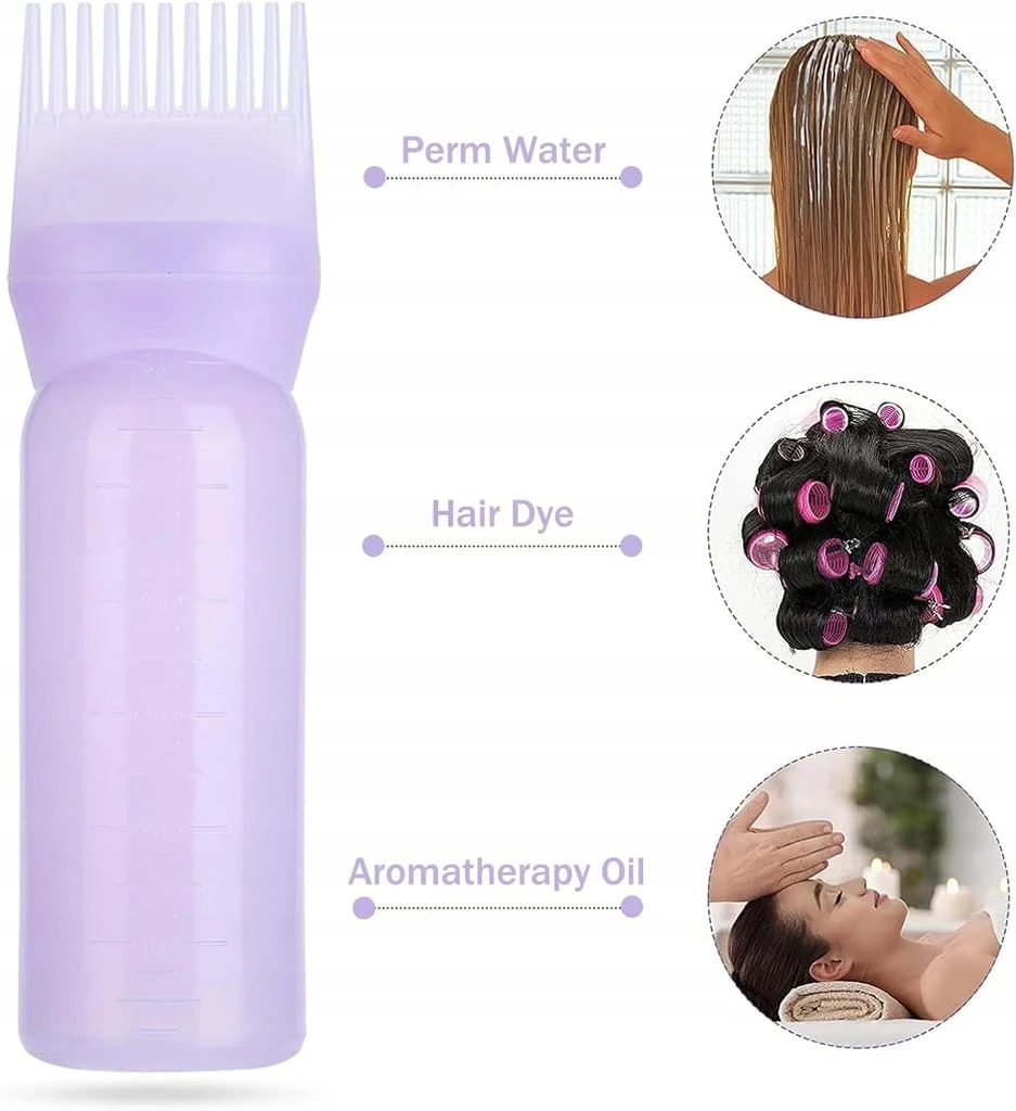 - ✅ Dobre narzędzie do farbowania włosów. Ta butelka olejku do włosów jest dostarczana z grzebieniem, dzięki czemu farbowanie włosów jest łatwiejsze niż w tradycyjny sposób. Po prostu wlej wstępnie zmieszany kolor do włosów lub odżywkę do butelki z grzebieniem u nasady, a następnie przeczesz i ściśnij, aby nałożyć roztwór, który spłynie na skórę głowy i cebulki