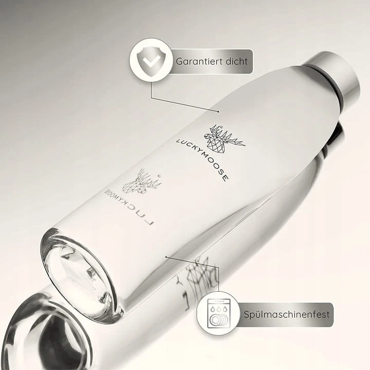 - ✅WYGODNE CZYSZCZENIE - Nie masz czasu? My też nie. Dlatego szklana butelka Luckymoose można myć w zmywarce. To pozostawia ci więcej czasu na ważne rzeczy w codziennym życiu.