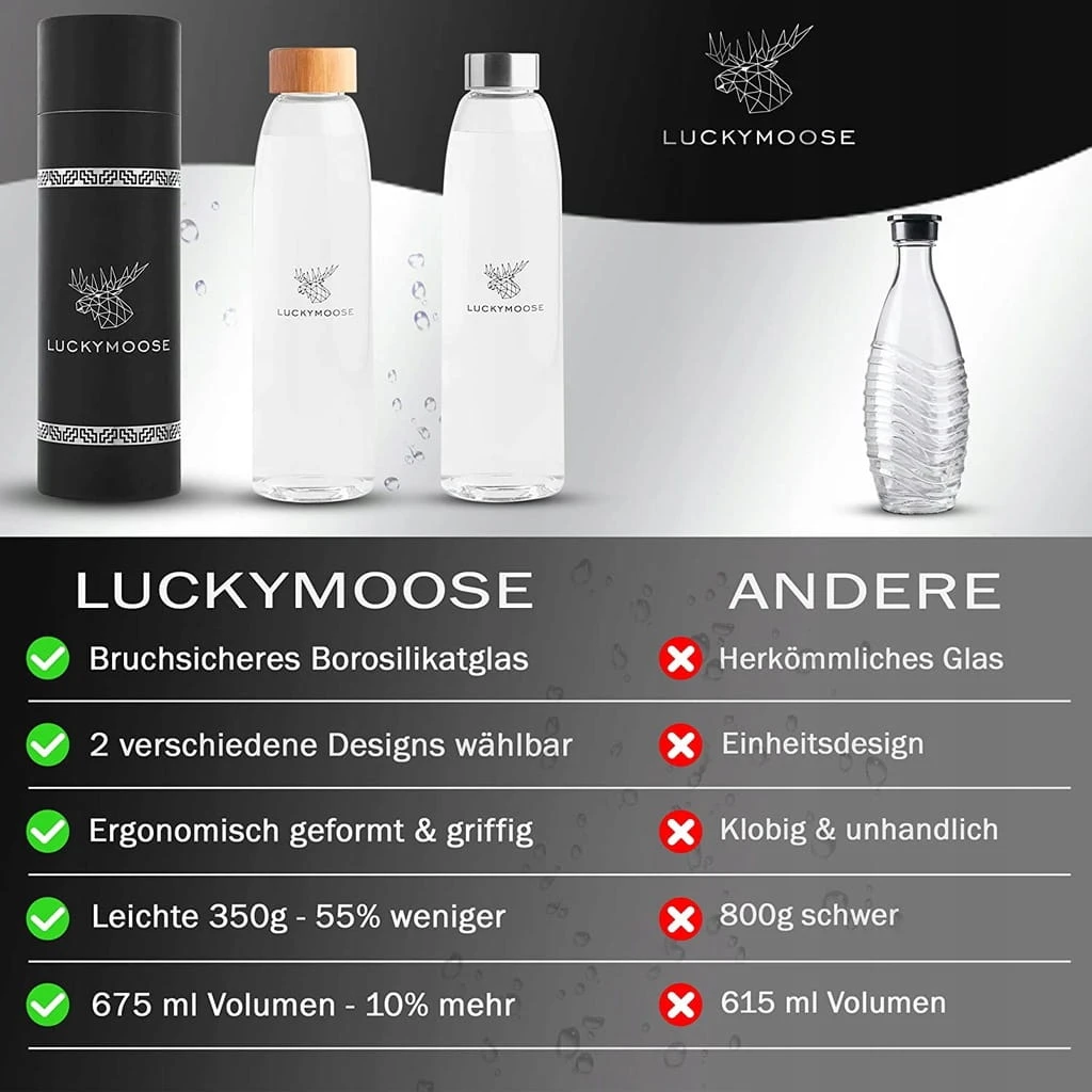 - ✅Szklana butelka Luckymoose nadaje się do wszelakich napojów i oferuje odświeżająco nowy i nowoczesny design. Pokaż znajomym różnicę !