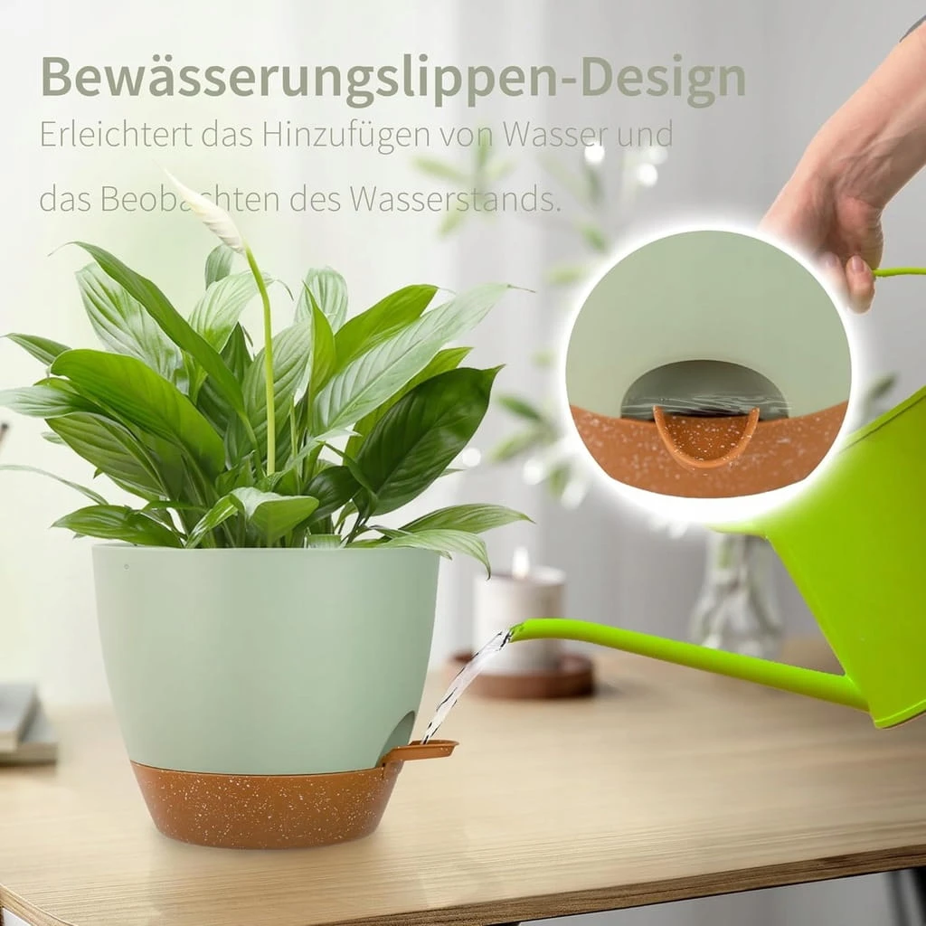 - ✅ Konstrukcja ust nawadniających. Doniczka samonawadniająca Dzięki zdejmowanej wardze nawadniającej można łatwo kontrolować ilość dodanej wody i mieć oko na aktualny poziom wody, aby upewnić się, że Twoje rośliny otrzymają odpowiednią ilość wody. System nawadniania ust odprowadza ponadto nadmiar wody.