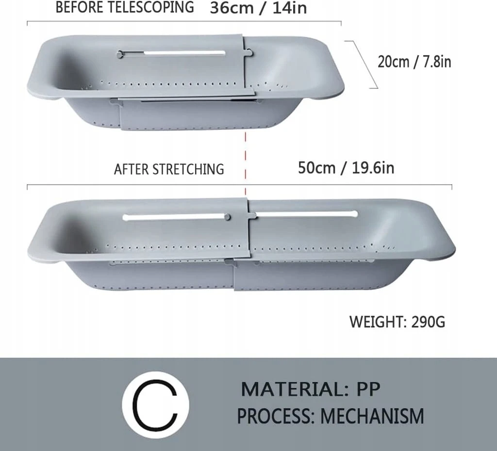 - Nowoczesny design – ten durszlak można regulować w zakresie od 36,8 cm do 49,5 cm, aby pomieścić więcej lub mniej, oszczędza miejsce, gdy nie jest używany i pasuje do większości zlewów. Po rozłożeniu do zlewu, dno unosi się od dna zlewu, zapobiegając ponownemu przepływaniu odsączonego makaronu do żywności.