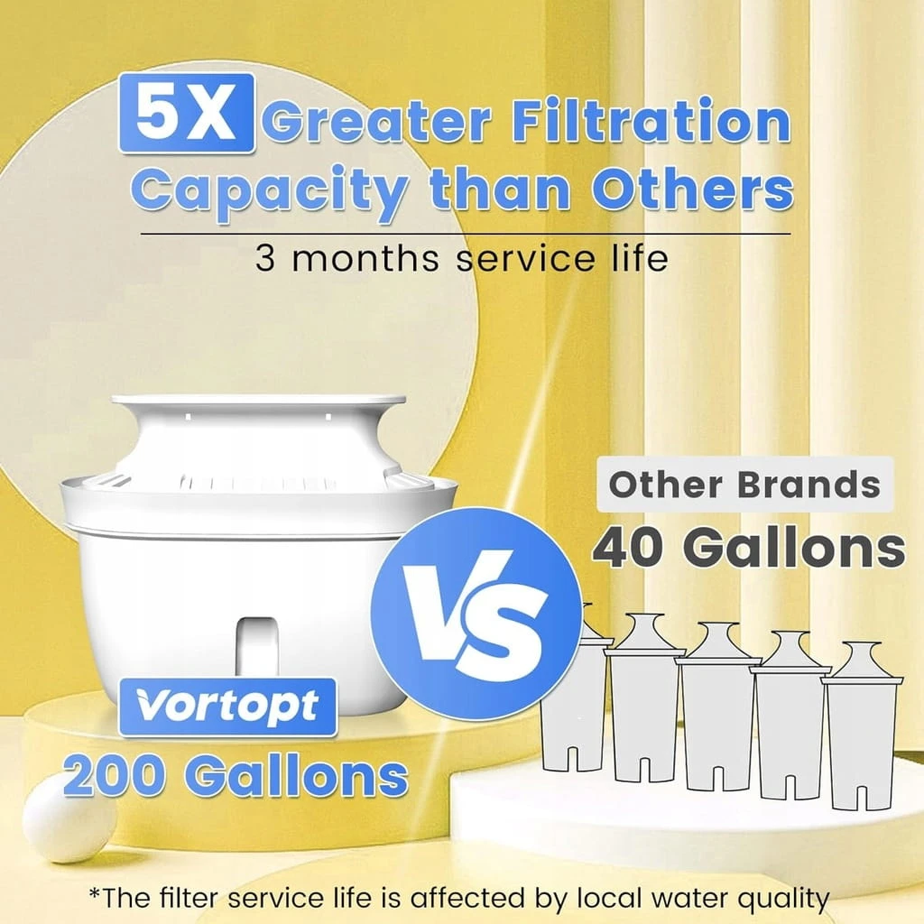 - ✅ Wydajność filtracji z certyfikatem CE: Dzbanek filtrujący do wody uzyskał certyfikat CE, który potwierdza użycie wyłącznie wysokiej jakości węgla. Filtr do wody Vortopt skutecznie redukuje zanieczyszczenia, takie jak rdza, osad, chlor, ołów, zapachy i poprawia smak, dzięki czemu woda jest czysta i zdrowa