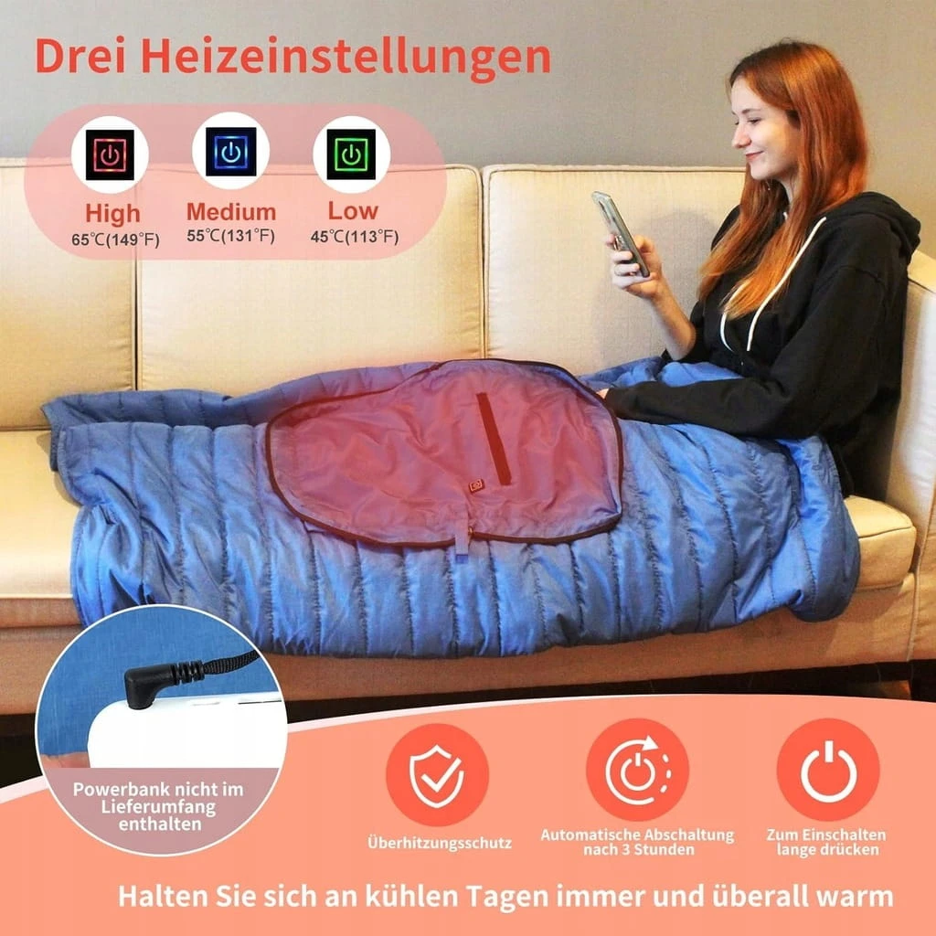- ✅ Trzy ustawienia grzania: Ciepły koc ma 3 regulowane temperatury i można go dostosować w razie potrzeby. Konstrukcja z jednym guzikiem sprawia, że korzystanie z koca elektrycznego jest bardzo łatwe. Wystarczy nacisnąć i przytrzymać długo, aby uruchomić koc elektryczny i krótko nacisnąć, aby zmienić bieg: najwyższa temperatura to 149°F-65°C (czerwony), średnia temperatura to 131°F-55°C (niebieski), a najniższa temperatura to 113°F-45°C (zielony).