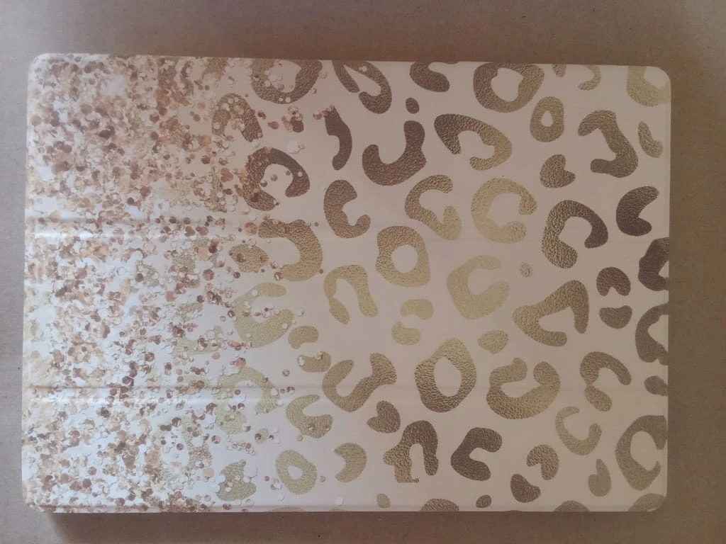 - Design: Modny wzór Leopard/Panterka z efektem złotego brokatu na klapce.