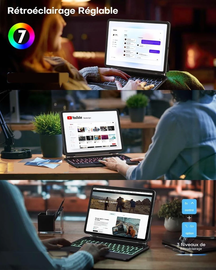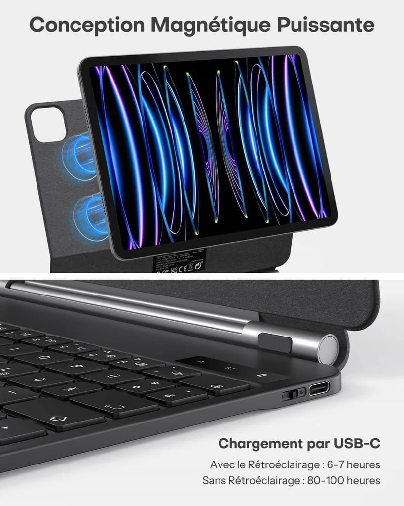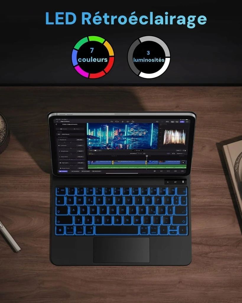 - ☑️ 7 kolorów Podświetlenie i długi czas czuwania: 11-calowa klawiatura Bluetooth do iPada Air ma 7 kolorów i 3 poziomy jasności, miękkie oświetlenie, które zapobiega swędzeniu oczu. Możesz dostosować kolor i jasność tak, jak chcesz, aby było przyjemniejsze w użyciu. Klawiatura ma dużą pojemność 500 mAh i może pracować do 100 godzin bez oświetlenia i do 8 godzin z oświetleniem.