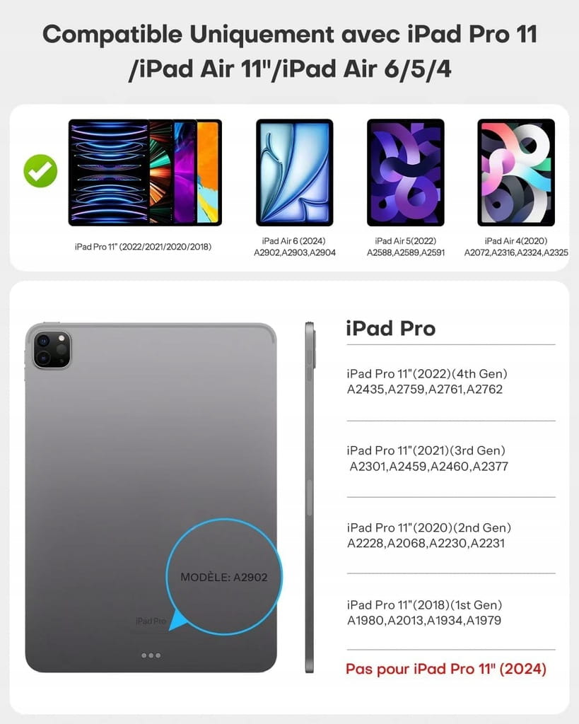 - ☑️ Kompatybilność: Klawiatura iPada jest kompatybilna z iPadem Air 11 cali 2025 2024 (M3/M2)/iPad Air 5 generacji 2022/iPad Pro 11 cali 2022/2021/2020/2018/iPad Air 4. generacji. Przed zakupem należy sprawdzić numer modelu Axxxx na spodzie iPada