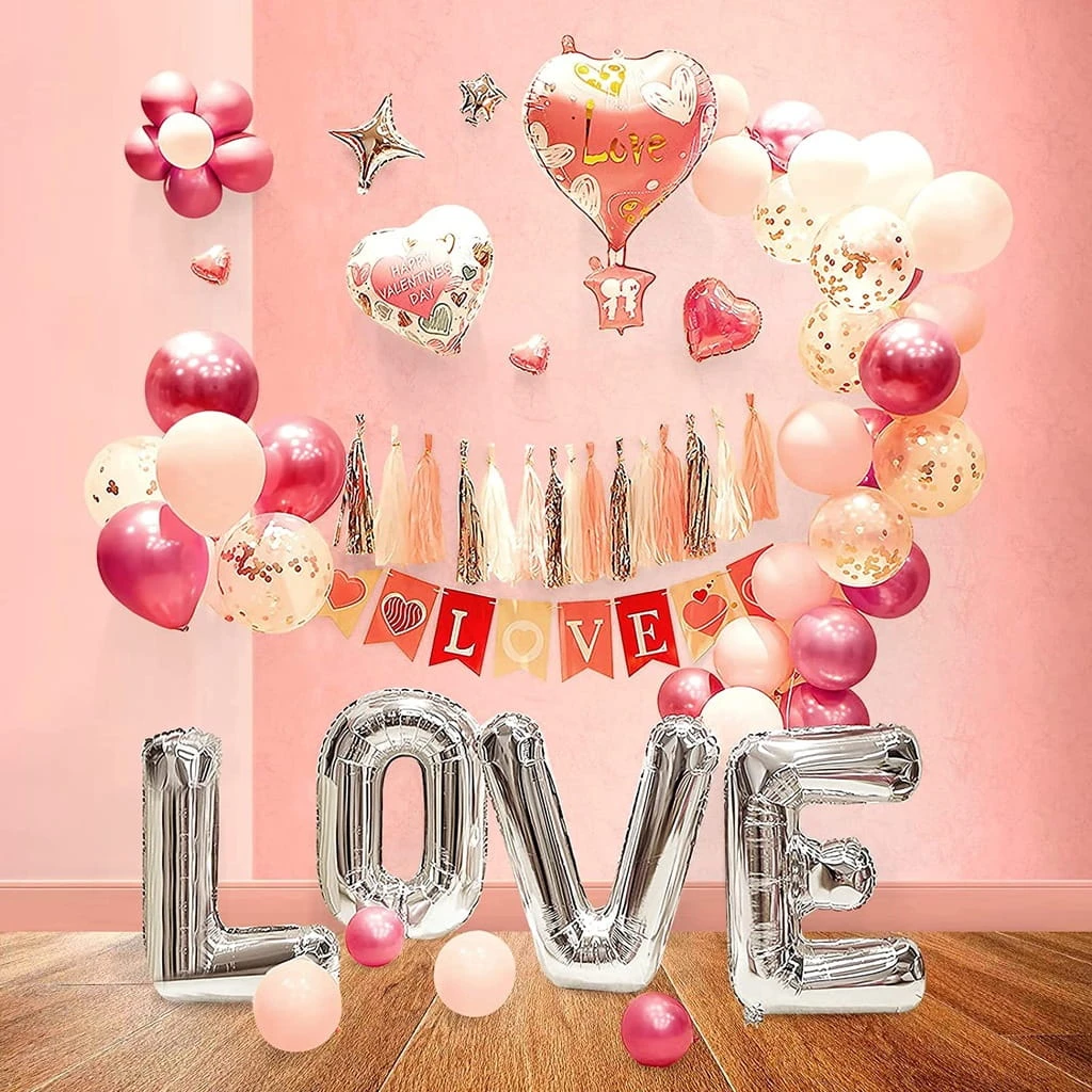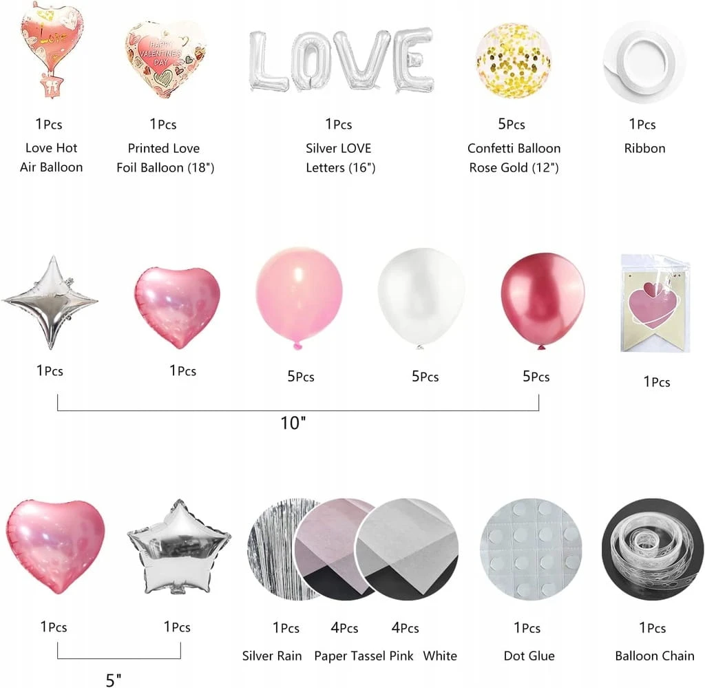 - co otrzymasz:Love Hot Air Balloon *1,18" Printed Love Foil Balloon *1,16" Silver LOVE Letters *1,10" Heart Pink Foil Balloon*1,5" Heart Pink Foil Balloon *1,10" Four-point Star Silver *1,5"Pentagram Silver *1,10"Macaron Balloon Pink *5, White *5,12 "Confetti Balloon Rose Gold *5,10" Metallic Balloon Red *5,LOVE Banner *1,The Silver Rain *1, Frędzle papierowe Różowy * 4, Biały * 4, Wstążka * 1, Łańcuch balonowy * 1, Klej punktowy * 1