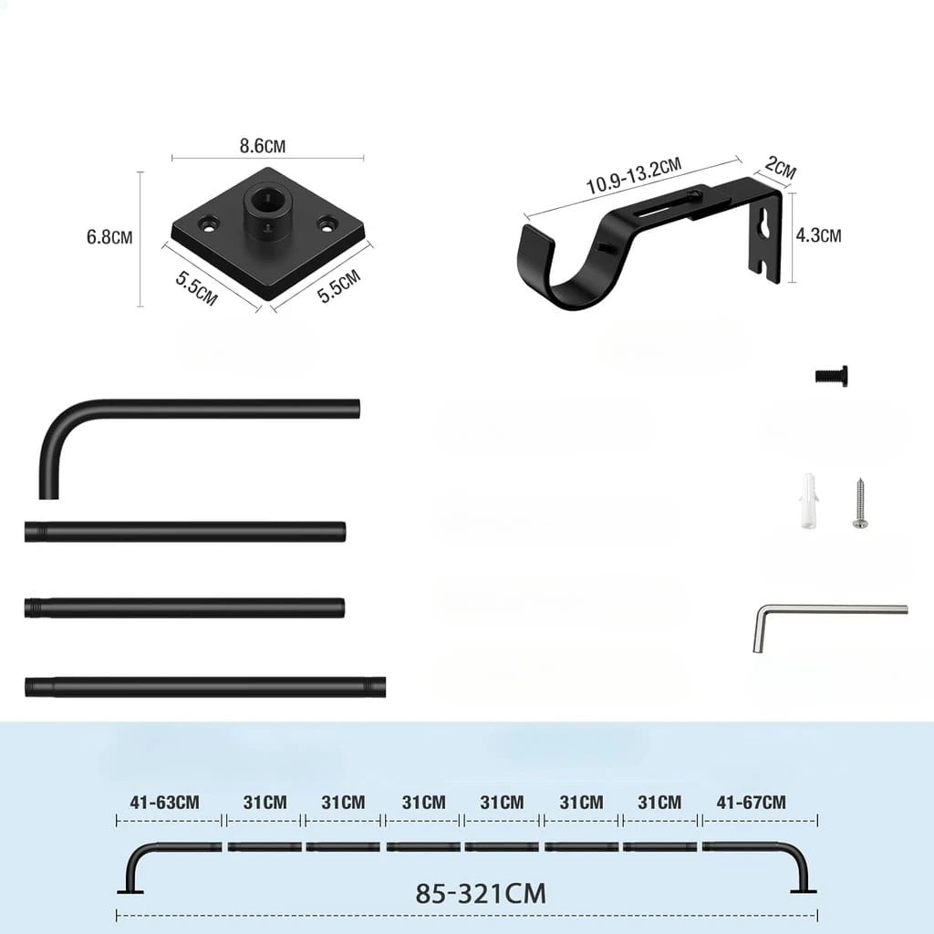 Karnisz jest rozsuwany i ma regulowaną długość od 85 cm do 321 cm, co pozwala na idealne dopasowanie do różnych szerokości okien.