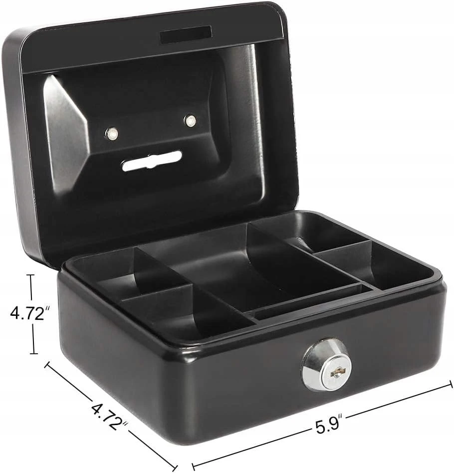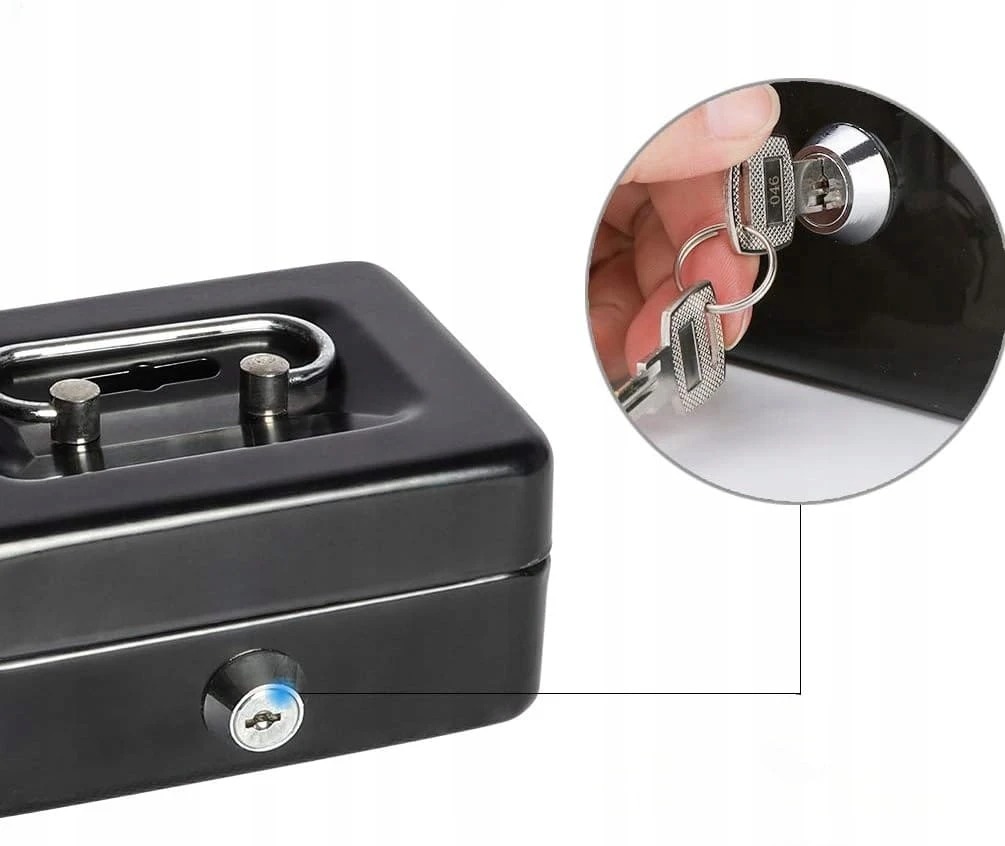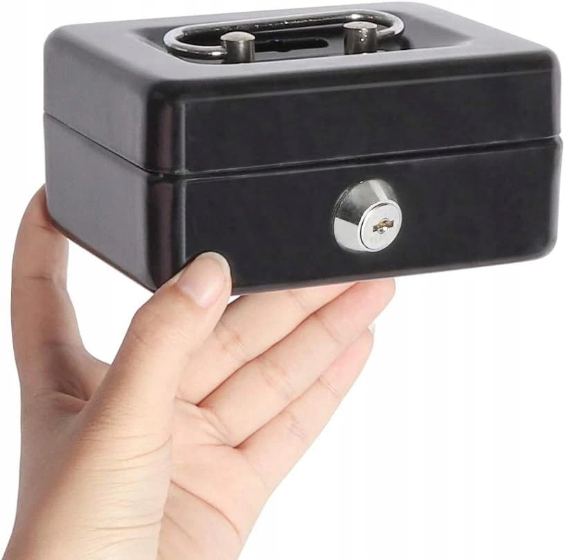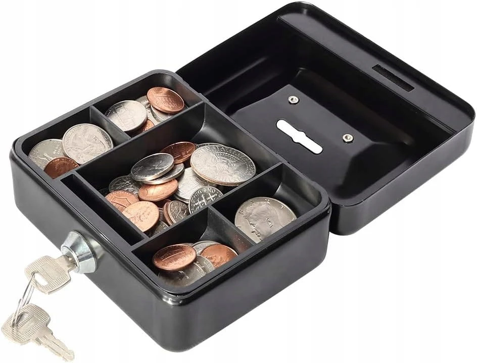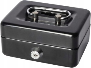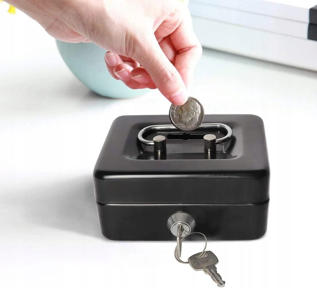 Kasetka na pieniądze – metalowa mini, skarbonka/sejf na bilon, na klucz