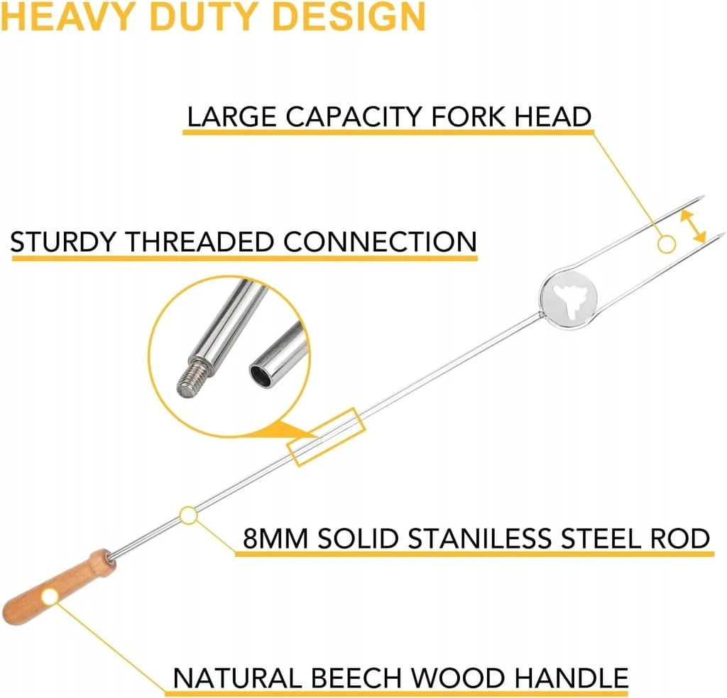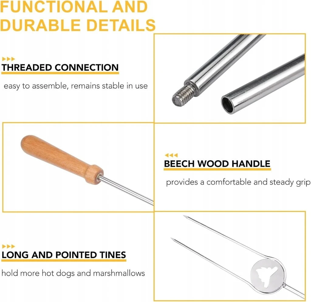 - ✅ Patyczki do pieczenia Perfect Fire: Patyczki do pieczenia ptasie mleczko są łatwe w montażu za pomocą gwintowanych słupków i pozostają stabilne po rozłożeniu do opiekania bez potrząsania. Wyposażone w dwa długie i spiczaste zęby, widelce do grilla z łatwością nabijają na raz więcej hot dogów, warzyw i szaszłyków.