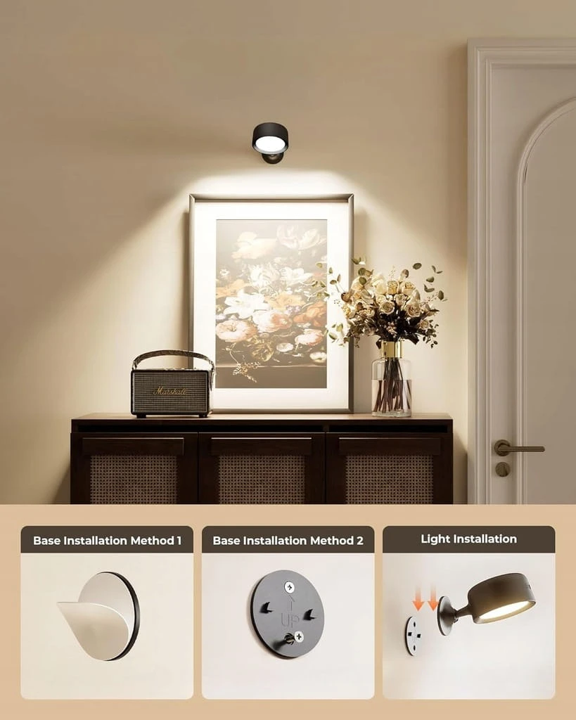 - ☑️ Precyzyjna instalacja z amortyzacją joysticka. Nowy system amortyzacji joysticka umożliwia ustawienie z dokładnością do milimetra – obracany o 360° i kąt nachylenia 90°. Instalacja bez użycia narzędzi przez 1 minutę, można ją usunąć bez pozostawiania śladów. Lampa ścienna LED nie wymaga śrub ani narzędzi do montażu. Wystarczy zdjąć z podstawy i używać jako przenośnej lampy.