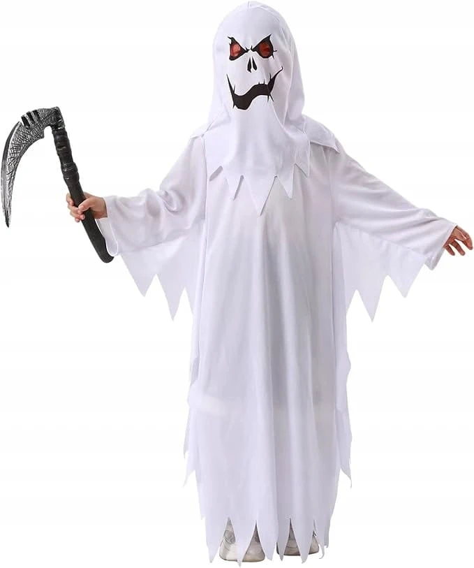 - ✅ Zestaw kostiumów dla dzieci: biały kostium na Halloween dla dzieci, składający się z szlafroka, sierpa i kaptura z przezroczystą kratką