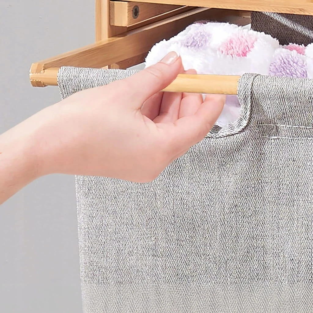 - ✅ WYSOKIEJ JAKOŚCI KONSTRUKCJA: Solidna rama wykonana jest z wytrzymałego, wodoodpornego bambusa: Worki na pranie wykonane są z mieszanki bawełny i poliestru; Łatwa pielęgnacja - Czyścić wilgotną szmatką; Nie prać w pralce