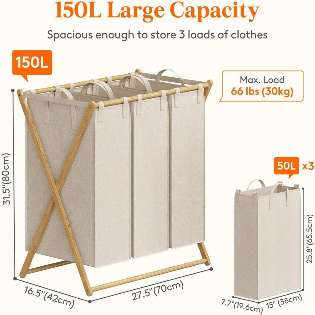 - ✅ Duży kosz na pranie 150 l: Ten 3-sekcyjny kosz na pranie jest wyposażony w trzy odłączane worki na pranie, każdy o pojemności 50 l, co daje łączną pojemność 150 l. Dzięki przestronnej konstrukcji ten bambusowy kosz na brudne ubrania może z łatwością pomieścić tygodniowe ubrania lub zabawki dla Ciebie i Twojej rodziny. To idealne rozwiązanie do prania dla akademików lub gospodarstw domowych.