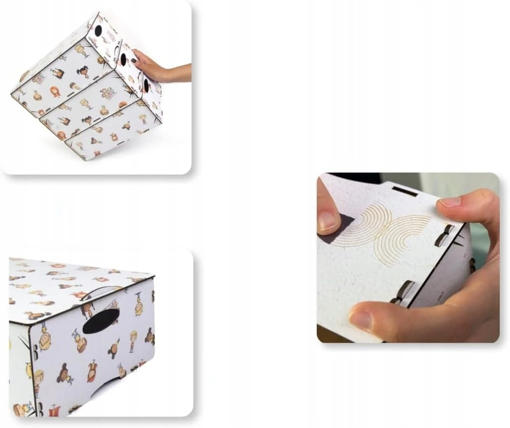 Pudełka są dostarczane jako zestawy montażowe, składające się z kolorowej folii MDF, którą można łatwo zmontować bez użycia narzędzi.