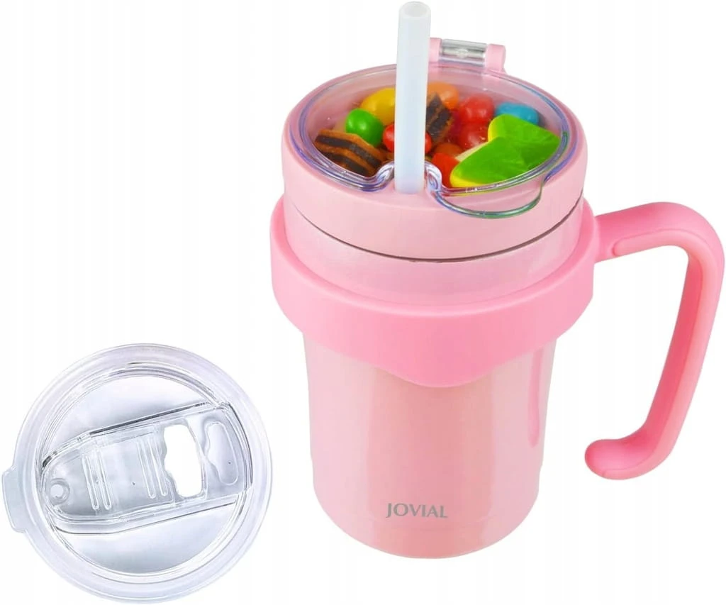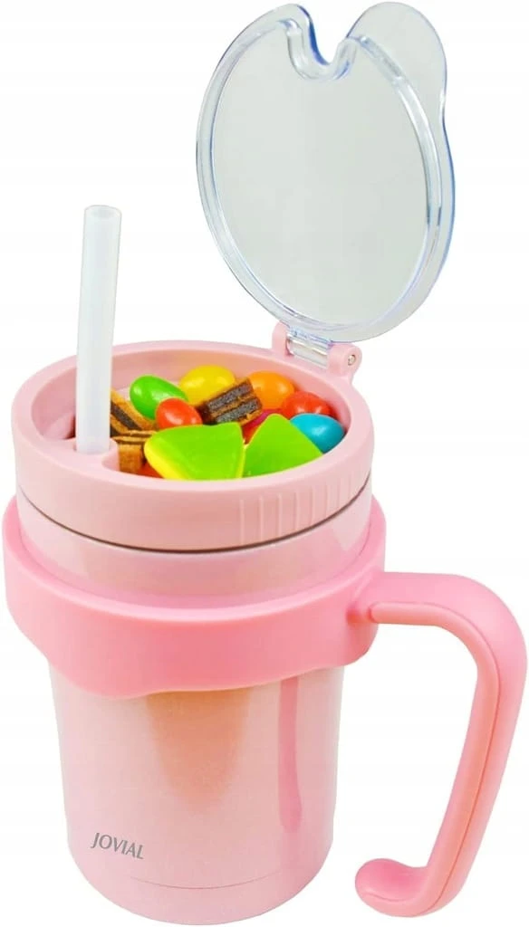 - ✅ JOVIAL All in One Snack and Drink Cup to nowy produkt combo, w tym miękka silikonowa słomka, którą dzieci mogą pić/sippy. W zestawie zdejmowany uchwyt, który jest łatwy do trzymania i oddzielony do czyszczenia. Pojemnik na przekąski nad kubkiem, sprawi, że dziecko będzie cieszyć się czasem picia. Możesz też użyć innej dodatkowej pokrywki jako izolowanego kubka do kawy lub filiżanki.