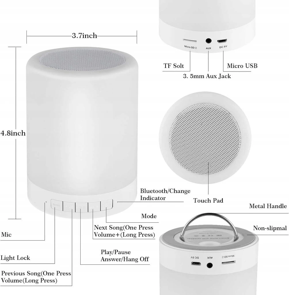 - ✅ Ciepłe światło i tryb zmiany koloru: Ciepłe białe światło z 3 poziomami jasności, dotknij pierścienia czujnika zmieni jasność lub wyłączy światło. Dotknij trybu głośnika przez dwie sekundy, przełącz się na tryb kolorowego światła i zmieni się 7 kolorów, dynamiczny tryb oświetlenia zależy od głośności muzyki