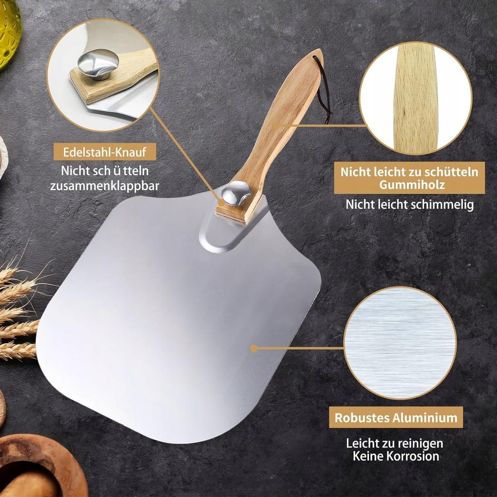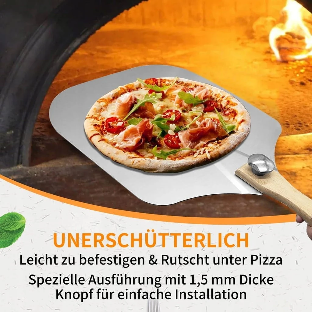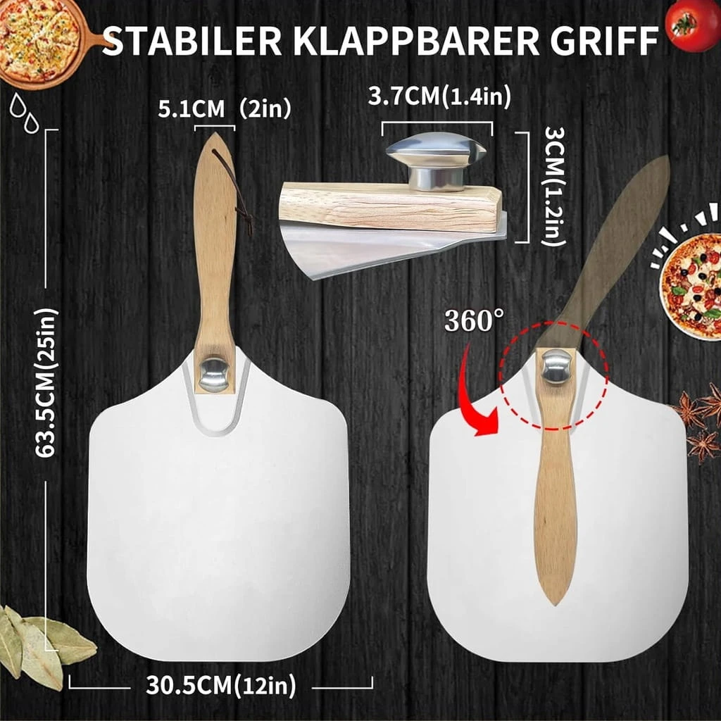 - ✅ Składany uchwyt i łatwe przechowywanie. Zaletą popychacza do pizzy jest pokrętło regulacyjne i uchwyt blokujący, które można łatwo zamocować, aby stabilnie przenosić pizzę. Rozciąga się na 63,5 cm długości, co wystarczy, aby uchronić Cię przed poparzeniem przez głęboki piec do pizzy lub gorący kamień do pizzy. Po złożeniu serwer do pizzy ma wymiary 30,5 * 35,6 cm i można go umieścić w dowolnym rogu (umieścić lub zawiesić) w kuchni, restauracji, pizzerii dla smakoszy.