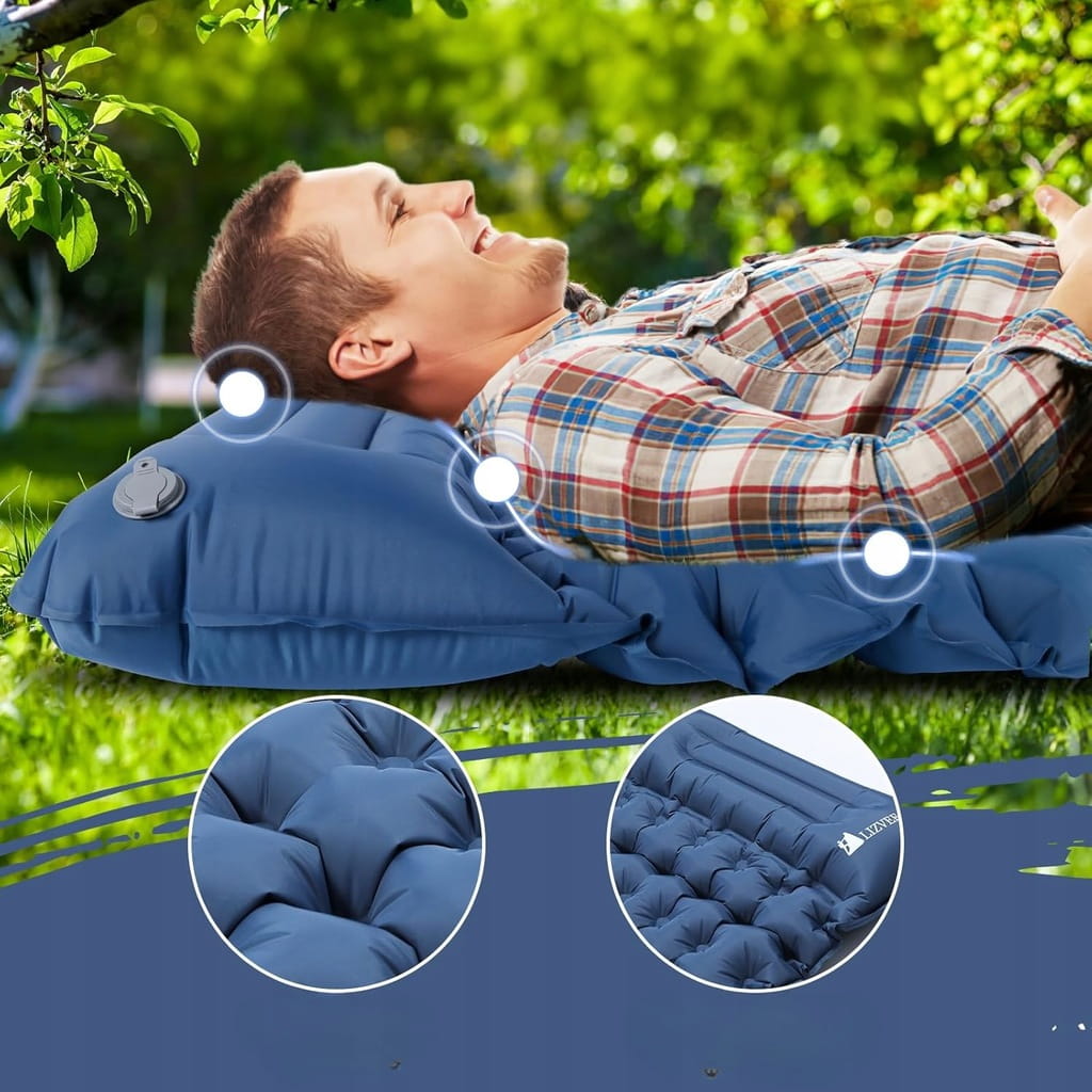 ☑️ Cechy produktu: Mata kempingowa zapewnia większy komfort i zadowolenie podczas aktywności na świeżym powietrzu, takich jak biwakowanie, wędrówki, wędkarstwo i wspinaczka. Nadaje się do układania na namiotach, trawnikach, plażach itp. Jeden zawór do nadmuchiwania i dwa zawory do opróżniania ułatwiają nadmuchiwanie i opróżnianie. Pompka nie jest wymagana. Szybko nadmuchaj nadmuchiwany materac stopami/rękami. I otwórz zawór spustowy materaca powietrznego, aby szybko go opróżnić. Wyboje i poduszka powietrzna zapewniają lepsze wsparcie i komfort dla ciała i głowy. W zestawie torba ułatwiająca przenoszenie i przechowywanie. Nadaje się do wędrówek, biwakowania, wędkowania, trekkingu, wspinaczki itp.