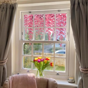 Piękny motyw kwiatowy: Różowe kwiaty tworzą efektowną dekorację okien, przynosząc do wnętrza odrobinę romantycznego, różanego ogrodu.