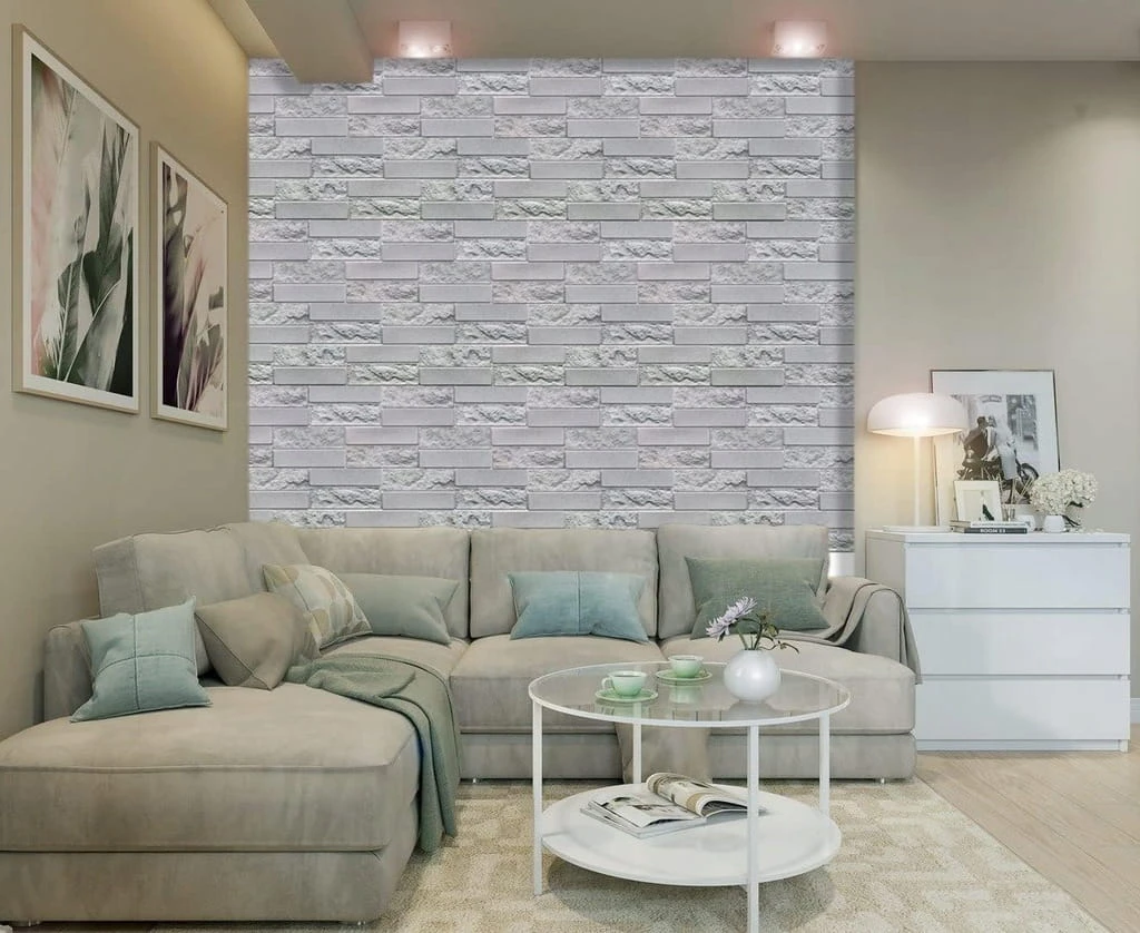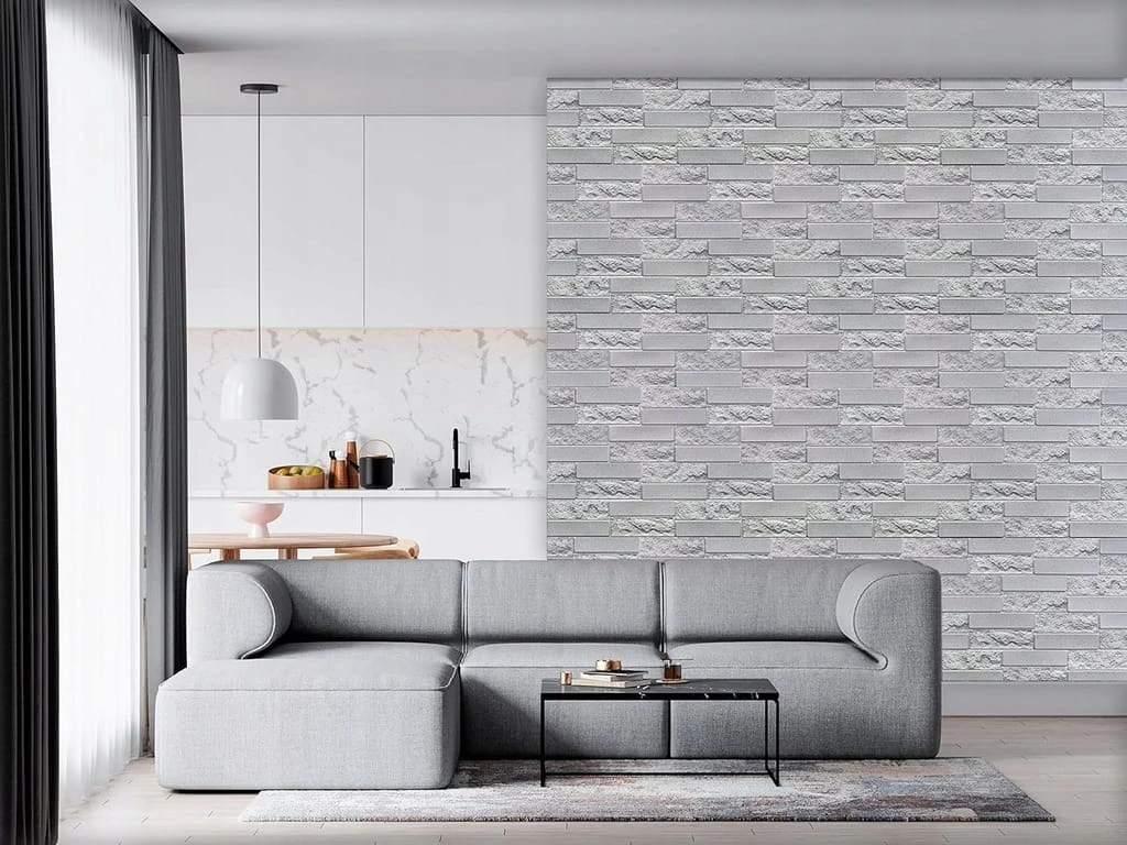 Stylowy wzór srebrnej cegły nada wnętrzu nowoczesny i elegancki charakter, doskonale sprawdzając się w sypialni, salonie, przedpokoju czy biurze.