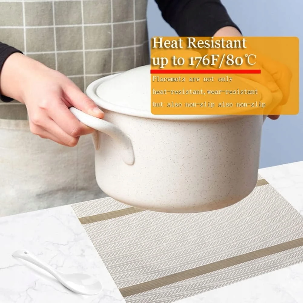 - Zmywalne, odporne na ciepło, antypoślizgowe, podkładki zapewniają skuteczną izolację do 80°C. Prasowanie ciepła w wysokiej temperaturze, które ochroni stół przed oparzeniami i stworzy przyjemne środowisko jadalne dla Twojej rodziny. Klasyczne dwustronne tkane rzemiosło, podkładka nie jest łatwa do usunięcia.