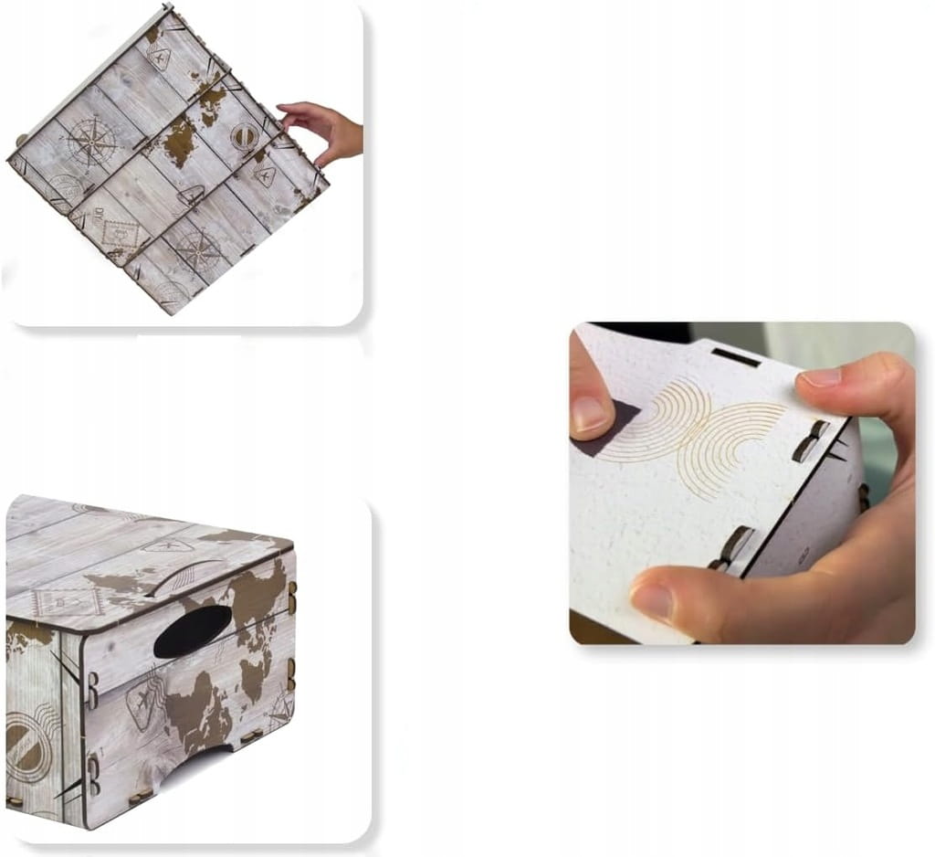 Pudełka są dostarczane jako zestawy montażowe, składające się z kolorowej folii MDF, którą można łatwo zmontować bez użycia narzędzi.