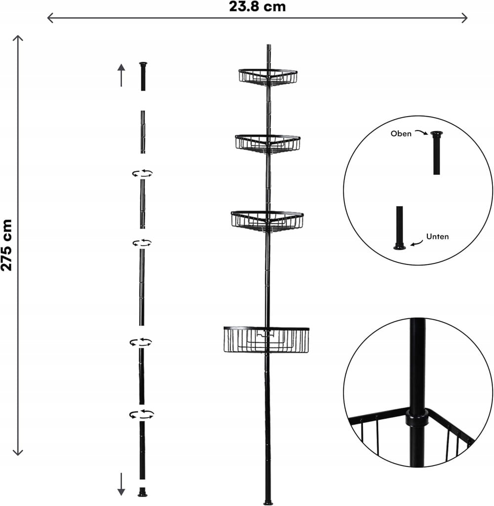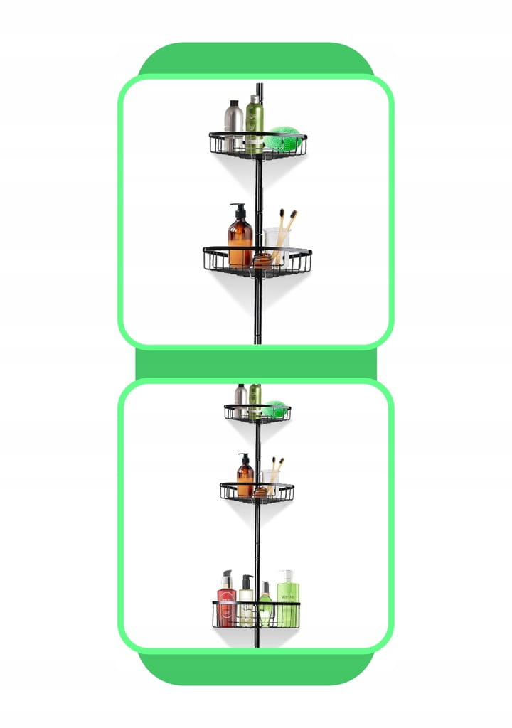 Nie potrzebujesz narzędzi ani wiertarki — półkę można zamontować w kilka minut! Wystarczy połączyć elementy, rozłożyć teleskopowy drążek i dopasować wysokość do swojej kabiny prysznicowej lub wanny. To idealne rozwiązanie do wynajmowanych mieszkań lub łazienek, w których nie można wiercić w płytkach.