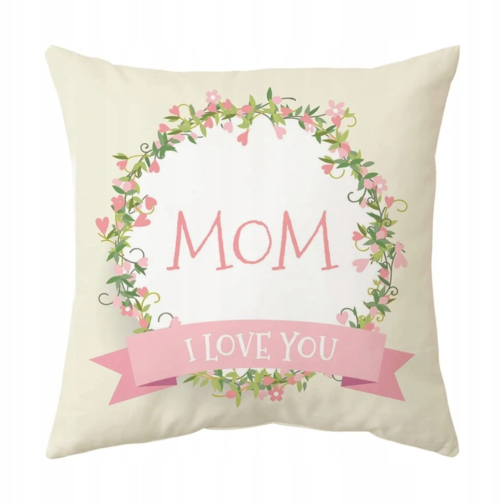 Poszewka ma jasne, kremowe tło, które stanowi subtelne tło dla centralnego, romantycznego wzoru. Sercem dekoracji jest delikatny wieniec z różowych kwiatów i zielonych listków, symbolizujący miłość i życie. W środku wianka widnieje duży napis „MOM”, a u dołu różowa szarfa z pięknym sentymentem: „I LOVE YOU” (Kocham Cię).