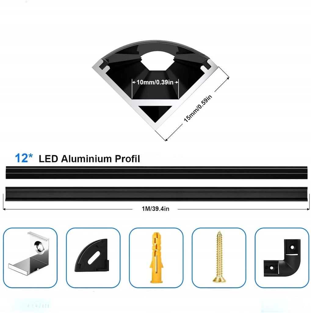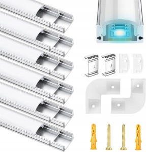 ☑️ Dwa modele do wyboru. Posiadamy profile LED w kształcie litery U i profile LED w kształcie litery V. Możesz wybrać model, który Ci się podoba w zależności od miejsca zastosowania. Oprócz 12 profili wraz ze wszystkimi akcesoriami montażowymi: 12 x mlecznobiała osłona, 24 x zaślepki, 24 x śruby, 24 x żółte śruby rurka rozprężna, 24 x metalowe klipsy montażowe i 6 x 90 stopni złącze wtykowe.