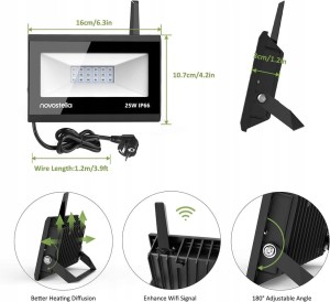 - Profesjonalna specyfikacja – reflektor WiFi z anteną. Wodoszczelność IP66. Szkło korpusu reflektora i metal są ze sobą połączone, a 12 wzmocnionych łusek z tyłu korpusu służy do zwiększenia powierzchni odprowadzania ciepła. Uchwyt jest regulowany o 180° i obsługuje montaż na ścianie. Wyposażony w europejską standardową wtyczkę i standardowy zasilacz sieciowy do użytku na zewnątrz. Długość kabla 1,2 m. Obsługuje wejście szerokonapięciowe AC 230 V.
