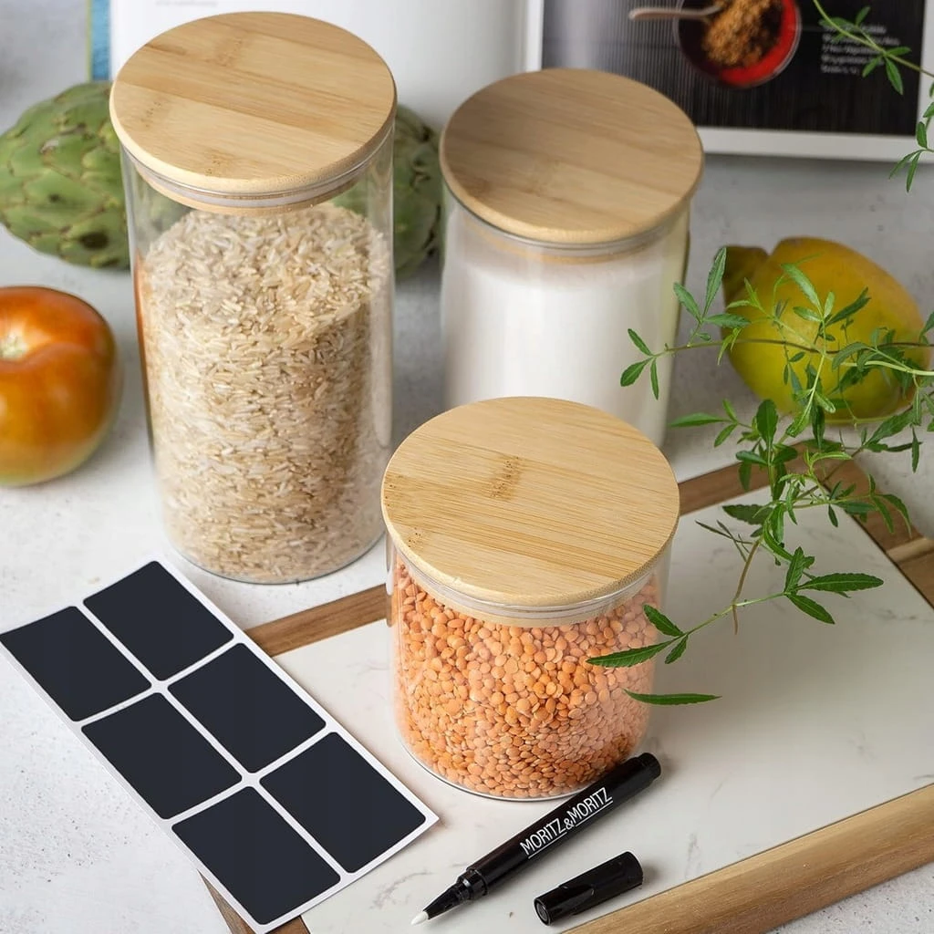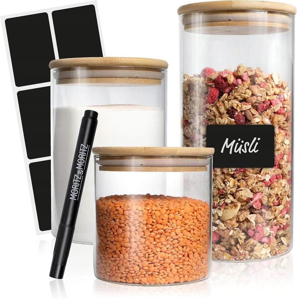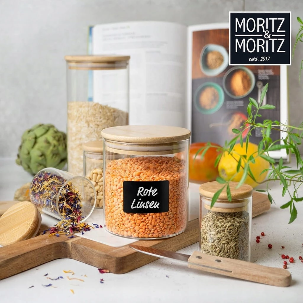 ✅ Zestaw słoików na zapasy – Moritz & Moritz 3 x słoiki z pokrywką w zestawie 6 naklejek tablicowych i 1 x zmywalny pisak kredowy. Hermetyczne do przechowywania mąki, ryżu, makaronu, musli i herbaty. Rozmiary: 500 ml (ok. 8 cm x 10 cm Ø) 750 ml (ok. 12 cm x 10 cm Ø) i 1500 ml (ok. 24 cm x 10 cm Ø)