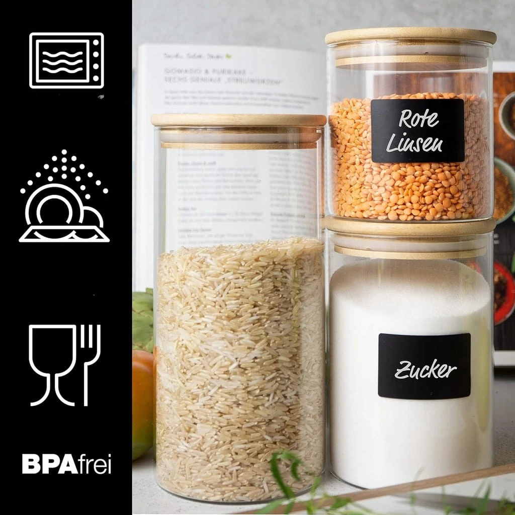 ✅ W zestawie akcesoria – w zestawie: 6 x naklejka do tablic i 1 x zmywalny pisak kredowy. Praktyczny do opisywania słoików z bambusową pokrywką