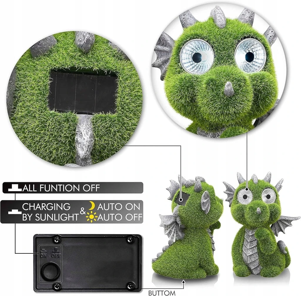 - ✅ Światło solarne. Przed użyciem należy włączyć przycisk na spodzie statuetki. Następnie należy trzymać produkt na słońcu, aby zapewnić wystarczającą ilość światła słonecznego. Ładowanie w ciągu dnia i automatyczne włączanie w nocy.