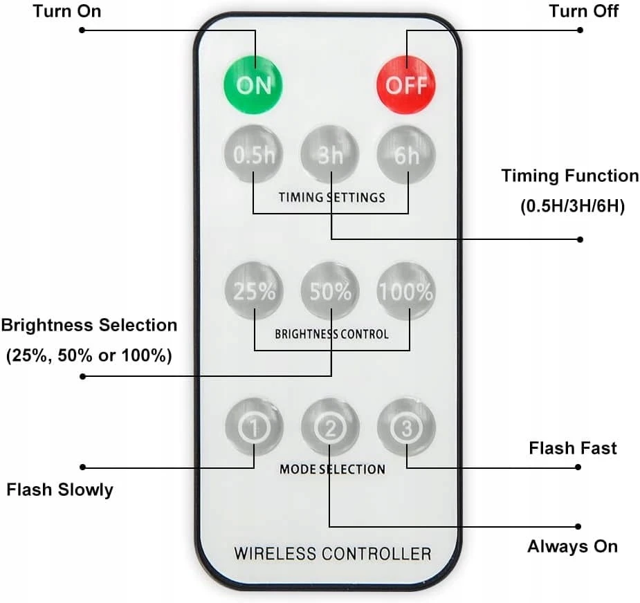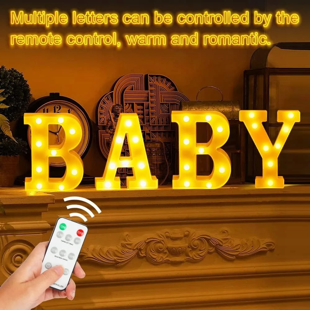 - Bezprzewodowy pilot zdalnego sterowania 360 ° - Każda litera BABY ma osobny przycisk przełącznika i jest zasilana 2 bateriami AA. Bezprzewodowy pilot zdalnego sterowania 360 stopni, jeden do podświetlania światełek z literami BABY. Dostępne są 3 ustawienia czasowe 0,5h, 3h i 6h. Możesz wybrać jeden z 3 poziomów jasności: 25%, 50% lub 100%. Lampka alfabetu może migać szybko, wolno lub zawsze świecić.