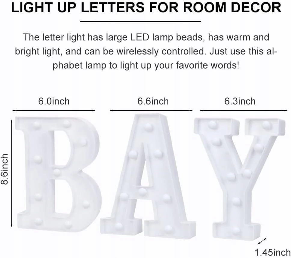 - Romantyczne litery BABY Light Up - "BABY, I want to give you all the romance" to nasza filozofia projektowania. Litery BABY są jak długopis i papier, jakby szepcząc do ucha: BABY. Gwiazdy są jasne, a słońce czyste. KOCHANIE, żyj chwilą i obejmij miłość i piękno. Użyj tej lampki alfabetycznej, aby oświetlić swoje ulubione słowa!