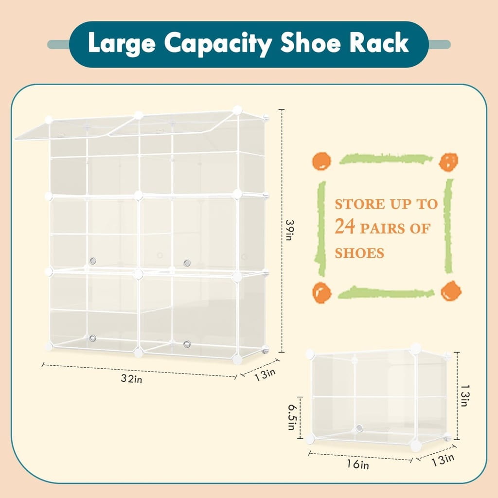 - ✅ Duża pojemność. 24 pary stojaków na buty zapewniają dużą przestrzeń do przechowywania butów. Każda kostka ma wymiary 16 "dł. x 13" szer. x 13 "wys., a cały organizer na buty 2 na 6 ma wymiary 32" dł. x 13" szer. x 39 "wys., spełniając wszystkie Twoje potrzeby w zakresie przechowywania.
