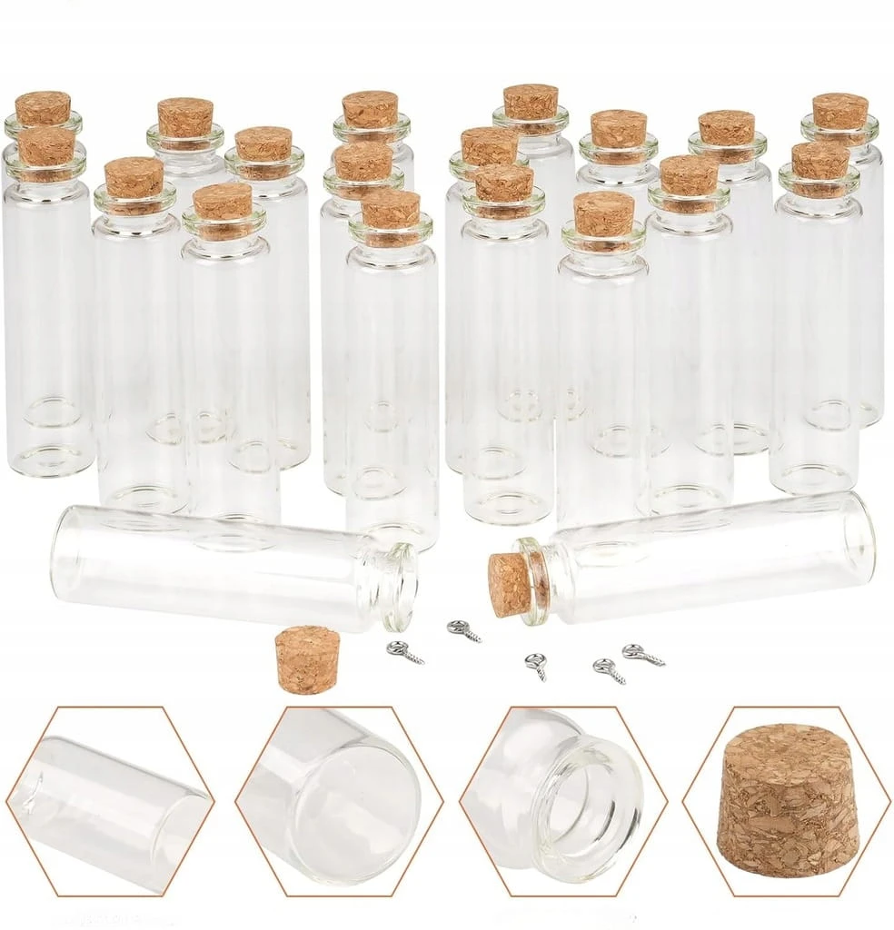 - ✅ Dopasowany korek. Mini szklane butelki z pasującym korkiem, idealnie pasują do wielkości otworu małych szklanych butelek. Z metalowym haczykiem na śruby, dzięki czemu szklana butelka dobrze się zamyka, idealna do przechowywania małych rzeczy.