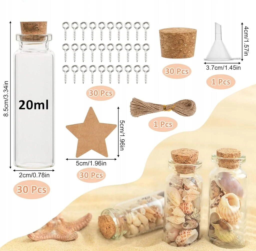 - ✅ Zestaw mini szklanych fiolek - zestaw zawiera 30 sztuk mini butelek szklanych (pojemność 20 ml, 8 x 2,2 cm) i 30 korków, 30 śrub, 30 kart, 1 rolkę liny, 1 lejek. Wystarczająca ilość i pełna kombinacja spełnią Twoje potrzeby w zakresie prac typu "zrób to sam" itd.