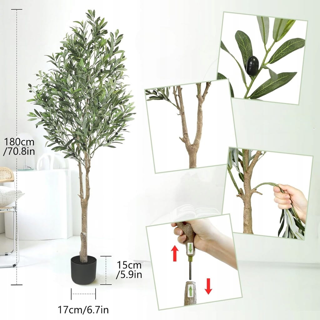 ☑️ Wymiary produktu - Sztuczne drzewo oliwne ma wysokość około 180cm, a doniczka ma średnicę około 17cm i wysokość około 15cm. Po otwarciu opakowania może być konieczne uformowanie rośliny, aby uzyskać pożądany wygląd.