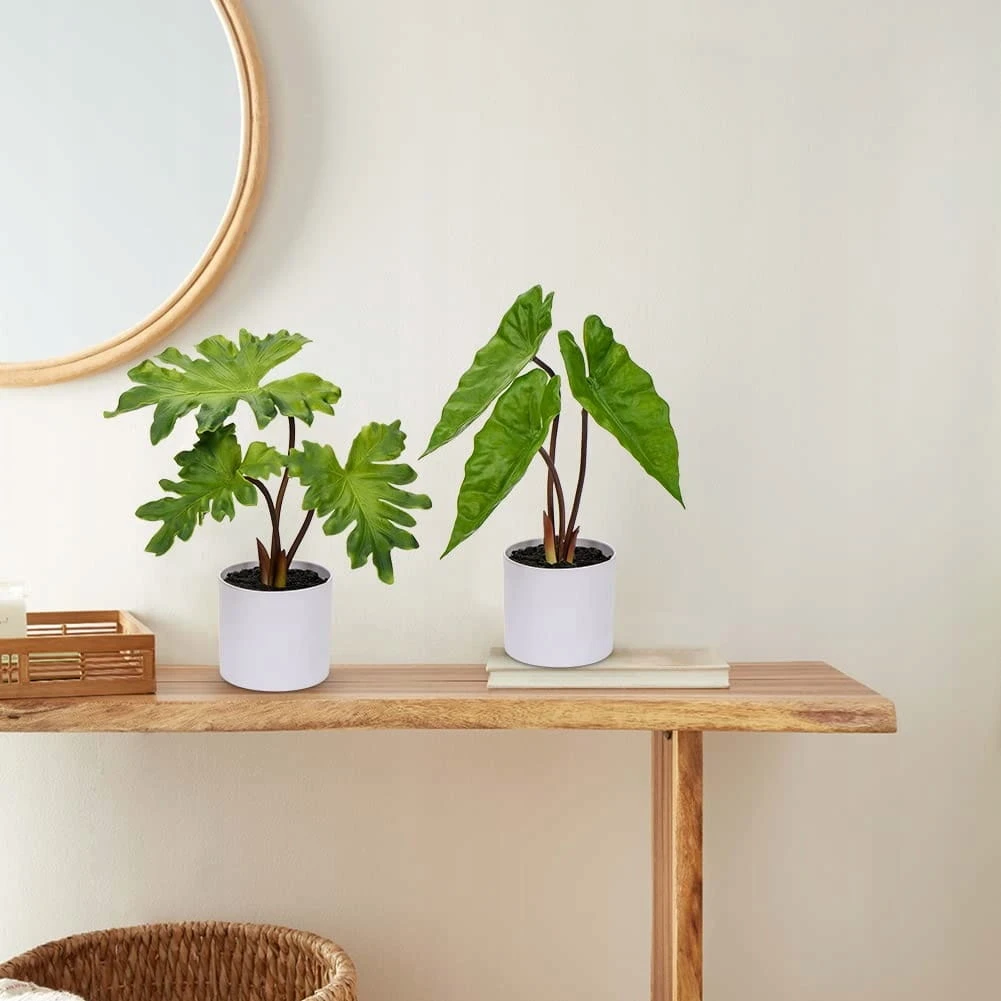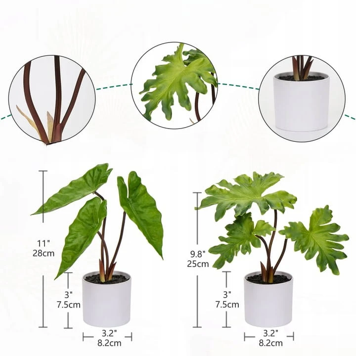 ✅ Rozmiar i pakiet. W zestawie 2 sztuki tropikalnej rośliny sztucznej małej. (Dwa rodzaje roślin). Sztuczny filodendron wysokość całej rośliny 25 CM. Sztuczna alokazja wysokość całej rośliny 28 CM. Matowa plastikowa doniczka: φ 8.2 CM, 7.5 CM wysokości. Lekka i stabilna. Doniczka z matową powierzchnią w ochronnym opakowaniu z pianki.