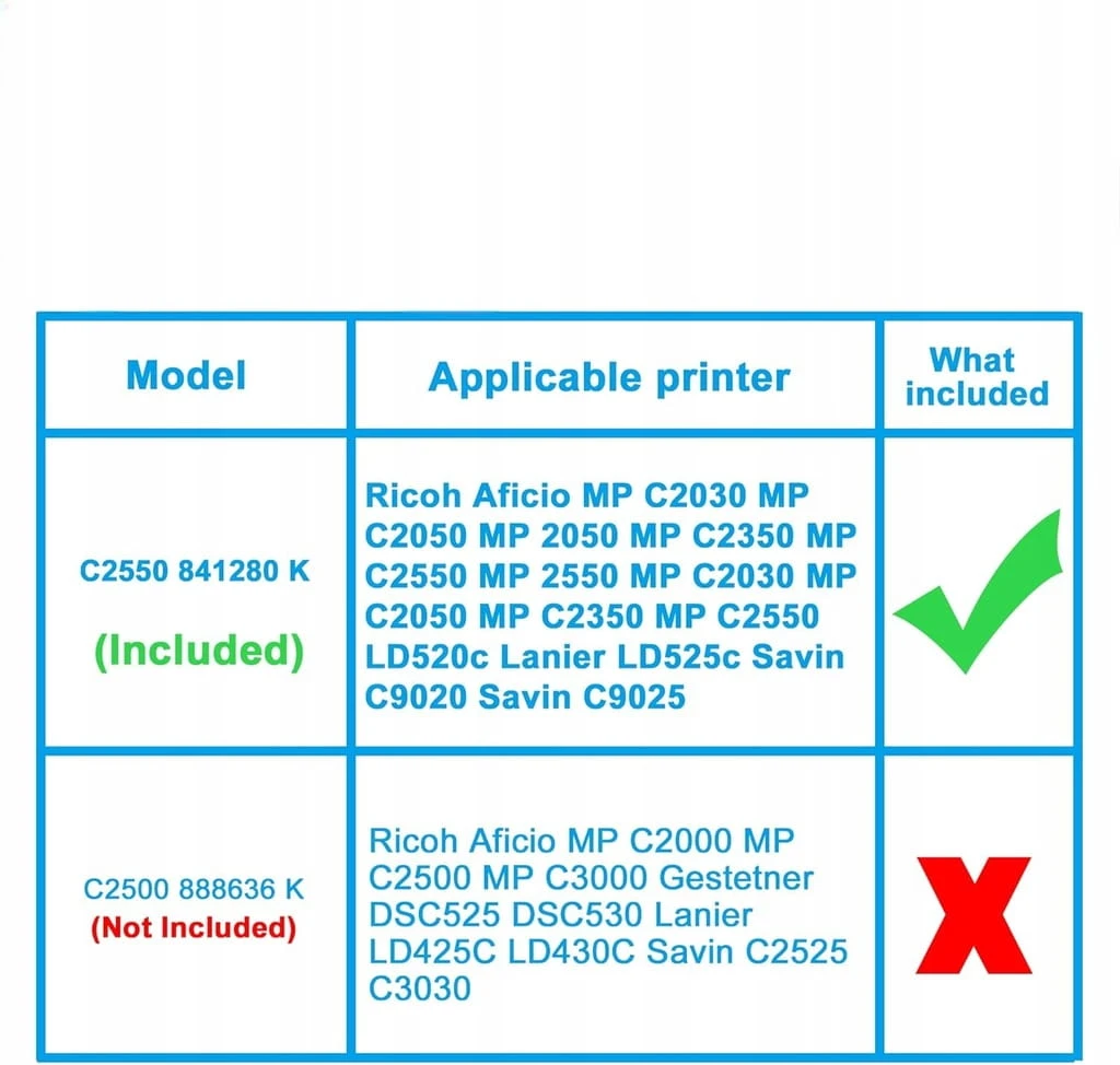 - ☑️ Kompatybilne drukarki: Zamienniki dla Ricoh Aficio MP C2030 C2050 2050 C2350 C2550 2550 C2030 C2050 C2350 C2550 LD520c Lanier LD525c Savin C9020 C9025