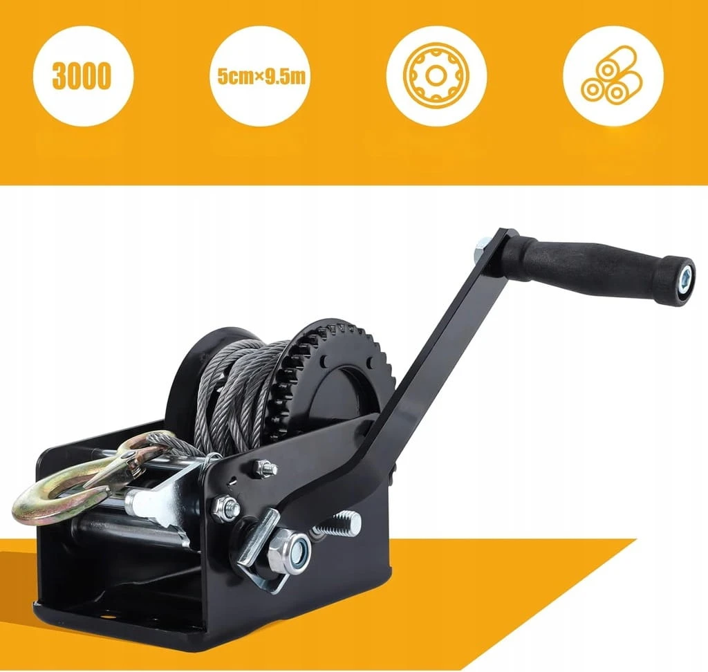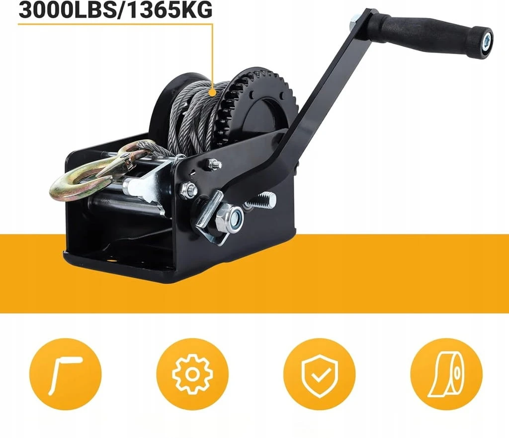 - ☑️ Wydajność: ta ręczna wciągarka ma siłę ciągnącą 1365 kg i ma doskonałe zdolności podnoszenia i trakcji. Wciągarka z wytrzymałą, antypoślizgową liną drucianą.