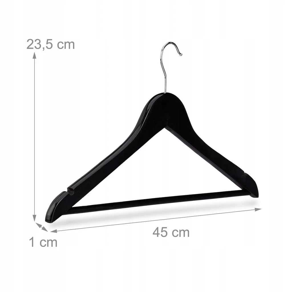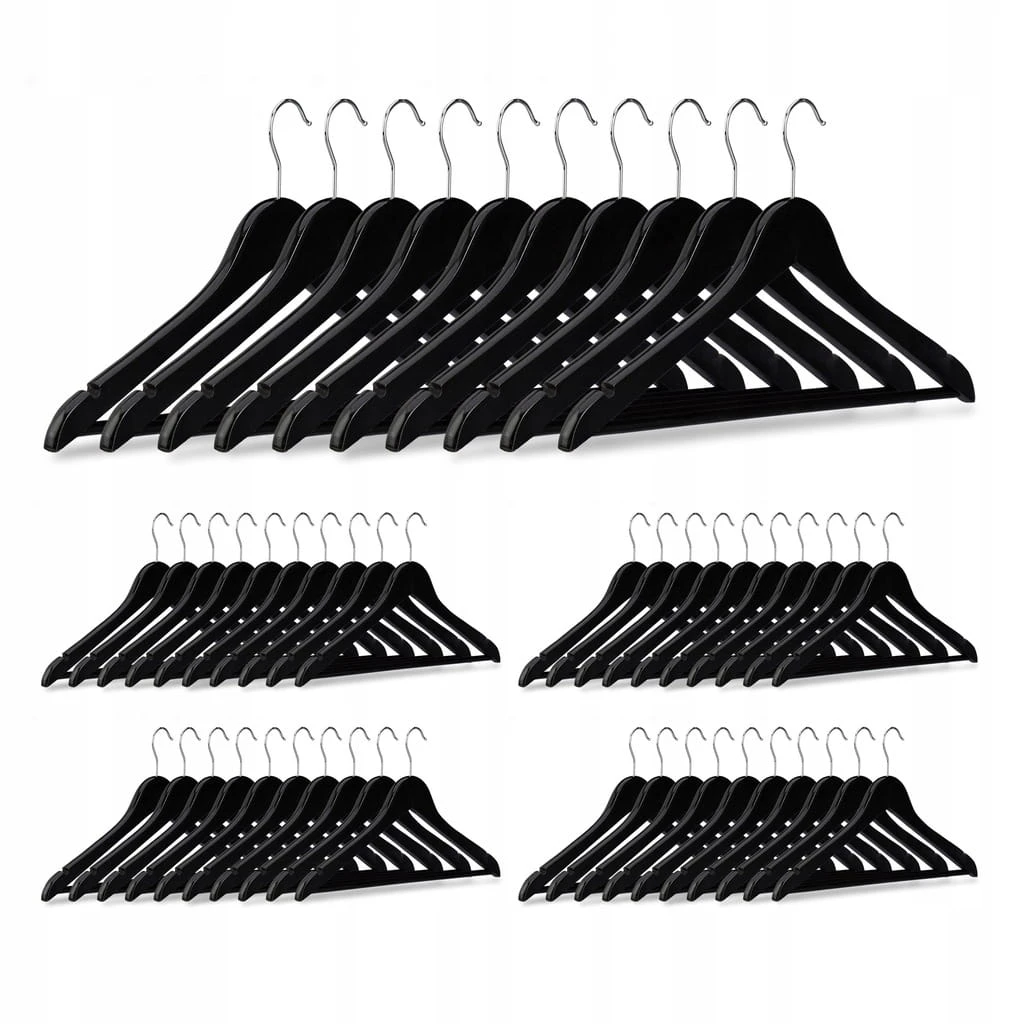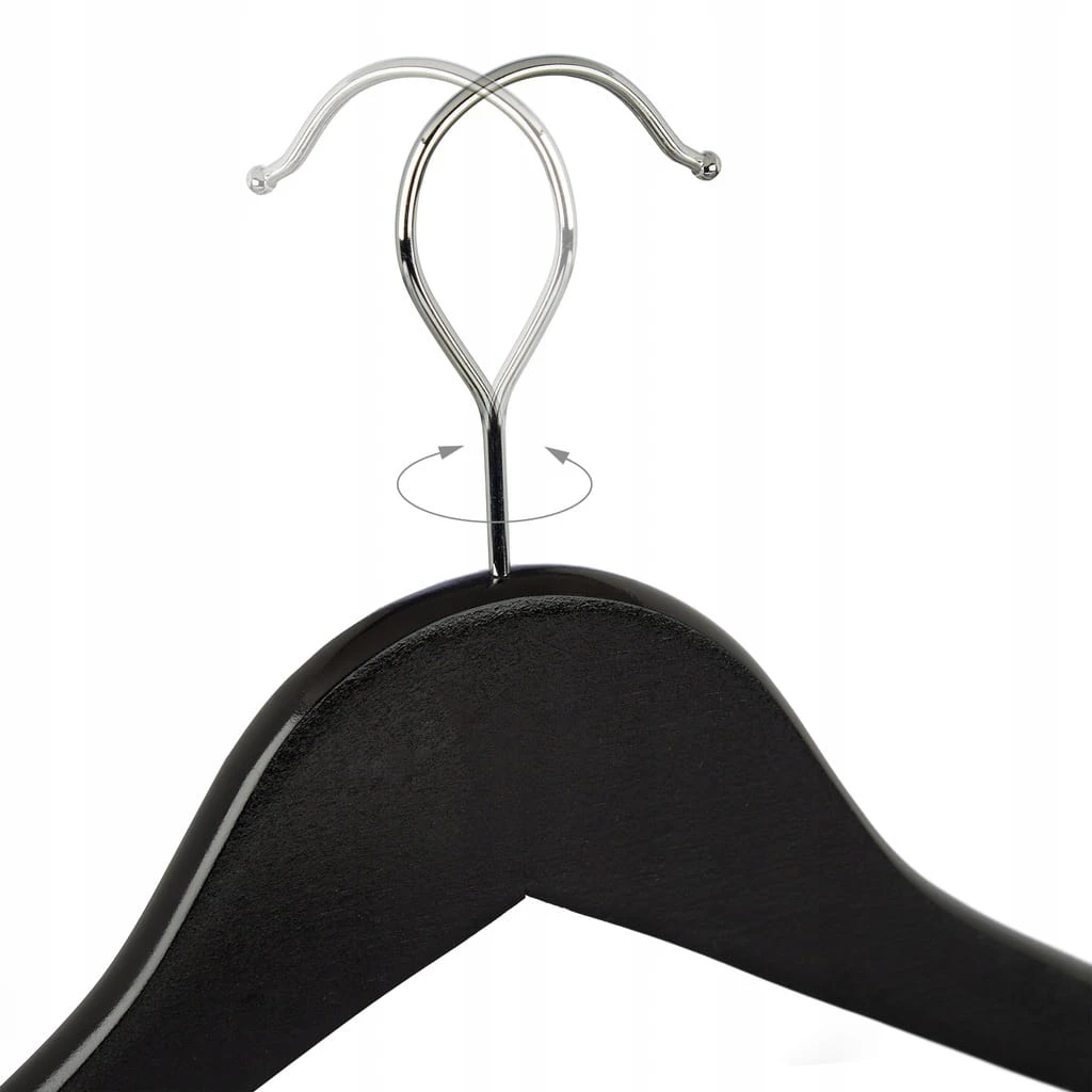 Zestaw klasycznych wieszaków na ubrania pozwoli Ci zaprowadzić porządek w Twojej garderobie. Dzięki tym wieszakom drewnianym Twoja odzież nie pogniecie się. Nasz zestaw 50 jednakowych wieszaków na odzież nadaje się do wieszania sukienek, koszul, bluzek i T-shirtów. Na tych uniwersalnych wieszakach z poprzeczką powiesisz również jeansy, spodnie z garnituru i wiele innych. Nasze wytrzymałe wieszaki do szafy sprawdzają się także w przypadku ciężkiej odzieży, takiej jak kurtki zimowe. Dzięki nacięciom po bokach z tych wieszaków odzieżowych nie zsuną się ani sukienki, ani topy na cienkich ramiączkach. Obrotowe haki ułatwiają odwieszanie wieszaków na drążku.