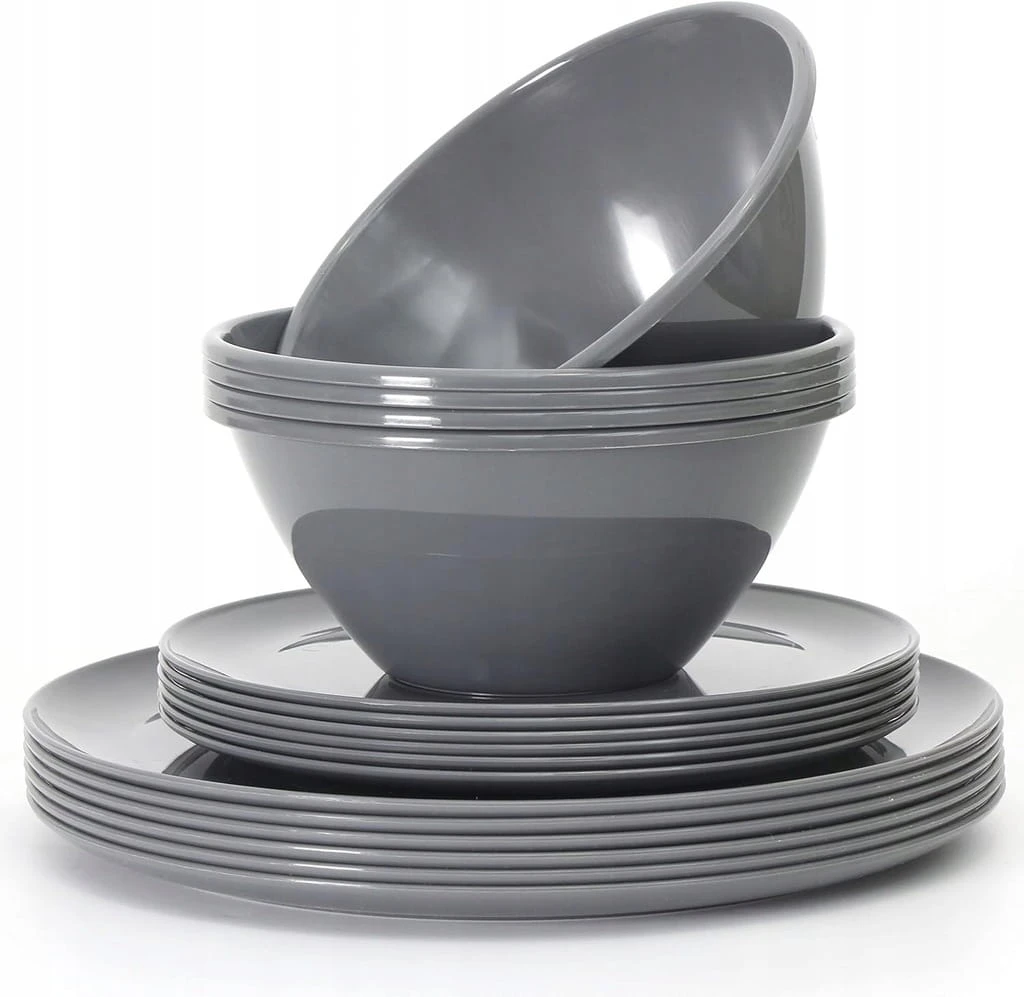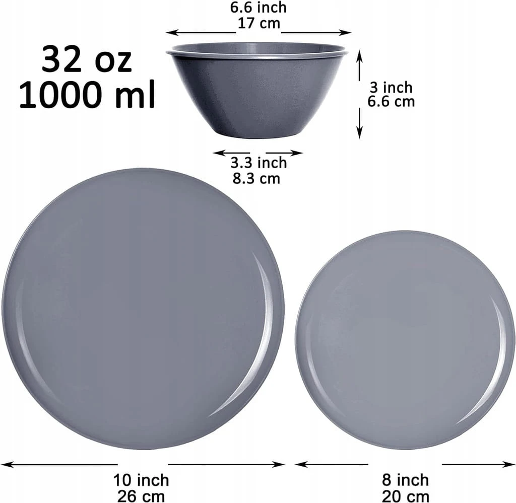 - ✅ Duży zestaw zastawy stołowej - Razem 18 szt. 6 zestawów plastikowej zastawy stołowej. Każdy zestaw zawiera miskę o pojemności 1000 ml, talerz 20 cm i talerz o średnicy 25 cm. Kolor ciemnoszary.