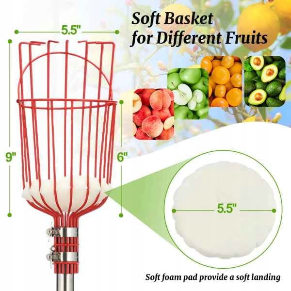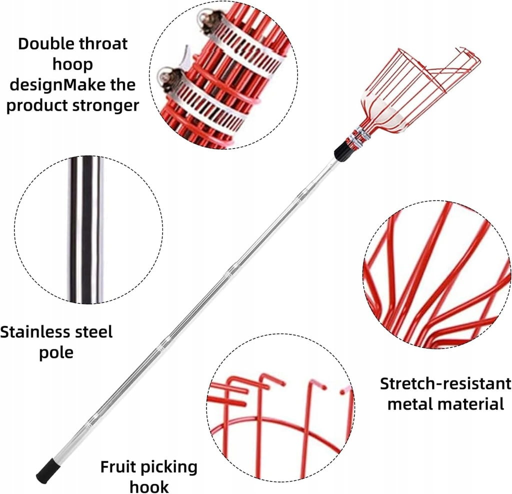 - ✅ Z metalowym koszem: Ten drążek do zbierania owoców ma duży i głęboki kosz na owoce. Owoce zebrane z drzewa wpadną bezpośrednio do metalowego kosza, który może pomieścić wiele owoców jednocześnie, a metalowy kosz ma ostre zęby haczykowe z boku., owoce można łatwo zebrać z drzewa.